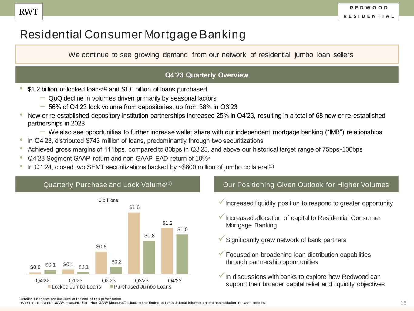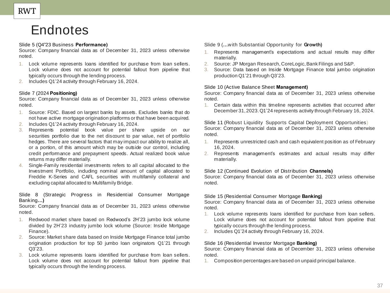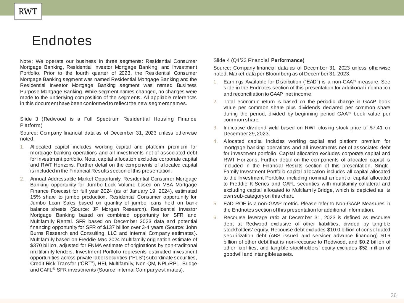 36 Note: We operate our business in three segments: Residential Consumer Mortgage Banking, Residential Investor Mortgage Banking, and Investment Portfolio. Prior to the fourth quarter of 2023, the Residential Consumer Mortgage Banking segment was named Residential Mortgage Banking and the Residential Investor Mortgage Banking segment was named Business Purpose Mortgage Banking. While segment names changed, no changes were made to the underlying composition of the segments. All appliable references in this document have been conformed to reflect the new segment names. Slide 3 (Redwood is a Full Spectrum Residential Housing Finance Platform) Source: Company financial data as of December 31, 2023 unless otherwise noted. 1. Allocated capital includes working capital and platform premium for mortgage banking operations and all investments net of associated debt for investment portfolio. Note, capital allocation excludes corporate capital and RWT Horizons. Further detail on the components of allocated capital is included in the Financial Results section of this presentation. 2. Annual Addressable Market Opportunity. Residential Consumer Mortgage Banking opportunity for Jumbo Lock Volume based on MBA Mortgage Finance Forecast for full year 2024 (as of January 19, 2024), estimated 15% share to jumbo production. Residential Consumer opportunity for Jumbo Loan Sales based on quantity of jumbo loans held on bank balance sheets (Source: JP Morgan Research). Residential Investor Mortgage Banking based on combined opportunity for SFR and Multifamily Rental. SFR based on December 2023 data and potential financing opportunity for SFR of $137 billion over 3-4 years (Source: John Burns Research and Consulting, LLC and internal Company estimates). Multifamily based on Freddie Mac 2024 multifamily origination estimate of $370 billion, adjusted for FNMA estimate of originations by non-traditional multifamily lenders. Investment Portfolio represents estimated investment opportunities across private label securities (“PLS”) subordinate securities, Credit Risk Transfer (“CRT”), HEI, Multifamily, Non-QM, NPL/RPL, Bridge and CAFL® SFR investments (Source: internal Company estimates). Endnotes Slide 4 (Q4’23 Financial Performance) Source: Company financial data as of December 31, 2023 unless otherwise noted. Market data per Bloomberg as of December 31, 2023. 1. Earnings Available for Distribution (“EAD”) is a non-GAAP measure. See slide in the Endnotes section of this presentation for additional information and reconciliation to GAAP net income. 2. Total economic return is based on the periodic change in GAAP book value per common share plus dividends declared per common share during the period, divided by beginning period GAAP book value per common share. 3. Indicative dividend yield based on RWT closing stock price of $7.41 on December 29, 2023. 4. Allocated capital includes working capital and platform premium for mortgage banking operations and all investments net of associated debt for investment portfolio. Capital allocation excludes corporate capital and RWT Horizons. Further detail on the components of allocated capital is included in the Financial Results section of this presentation. Single- Family Investment Portfolio capital allocation includes all capital allocated to the Investment Portfolio, including nominal amount of capital allocated to Freddie K-Series and CAFL securities with multifamily collateral and excluding capital allocated to Multifamily Bridge, which is depicted as its own sub-category on this chart. 5. EAD ROE is a non-GAAP metric. Please refer to Non-GAAP Measures in the Endnotes section of this presentation for additional information. 6. Recourse leverage ratio at December 31, 2023 is defined as recourse debt at Redwood exclusive of other liabilities, divided by tangible stockholders' equity. Recourse debt excludes $10.0 billion of consolidated securitization debt (ABS issued and servicer advance financing) $0.6 billion of other debt that is non-recourse to Redwood, and $0.2 billion of other liabilities, and tangible stockholders' equity excludes $52 million of goodwill and intangible assets.