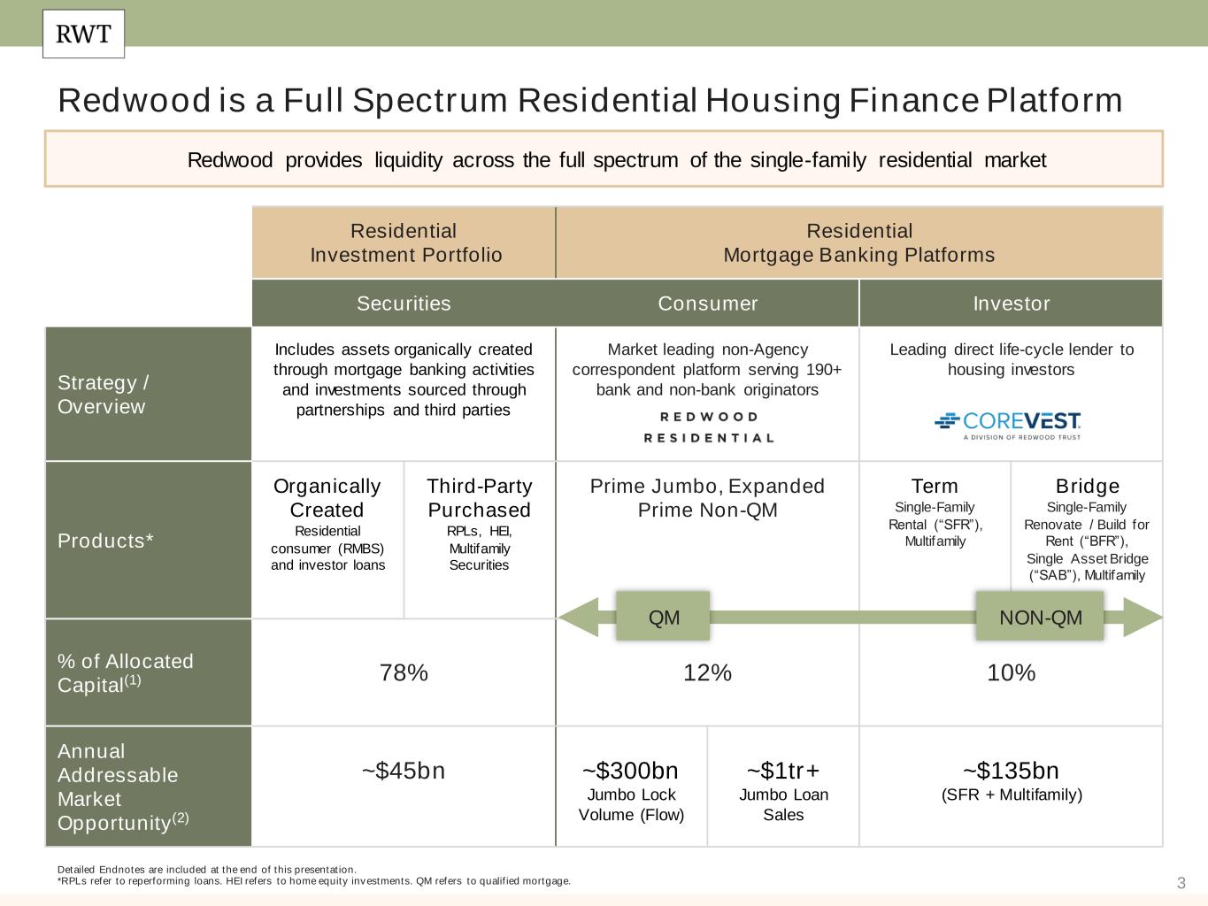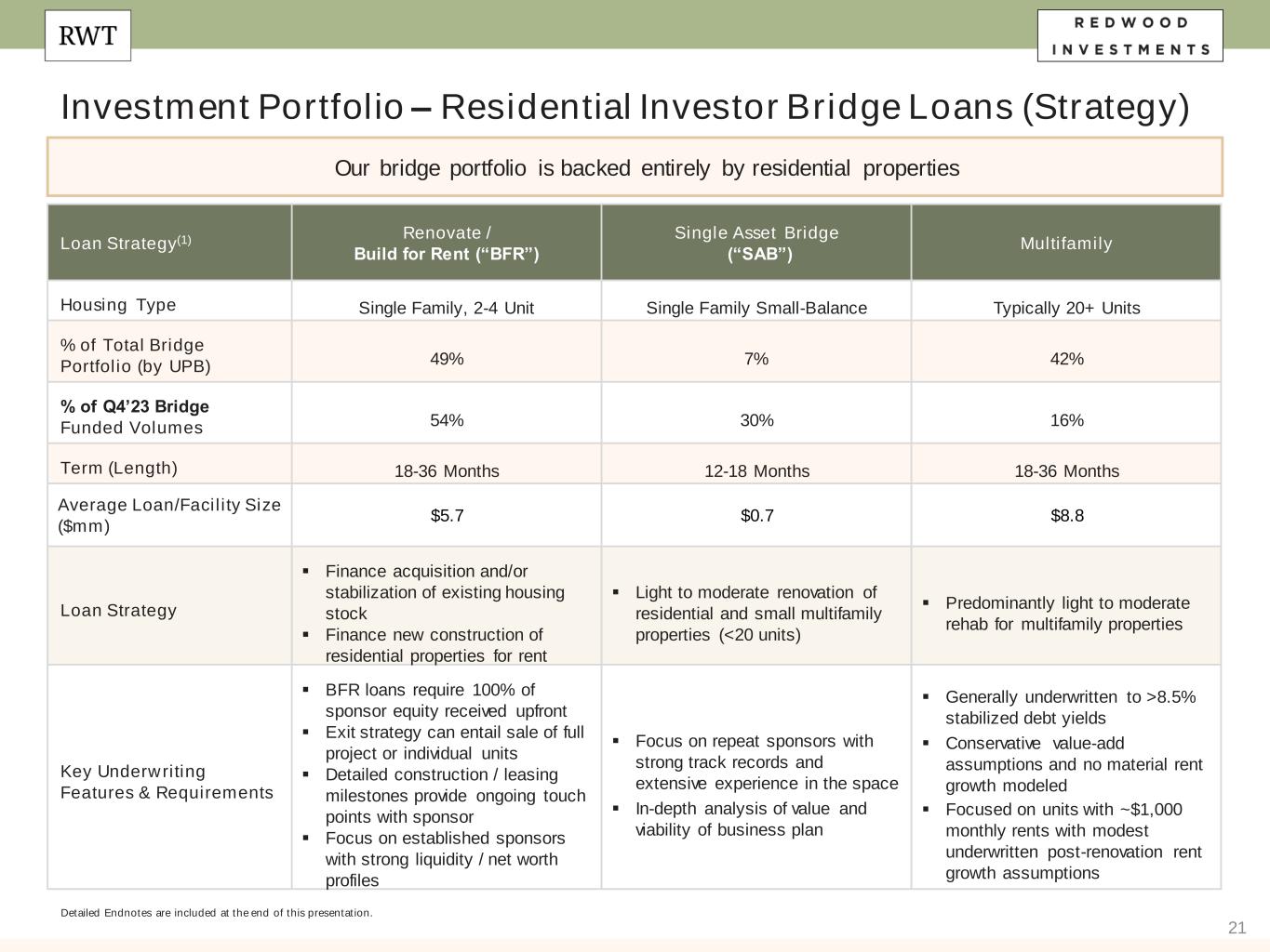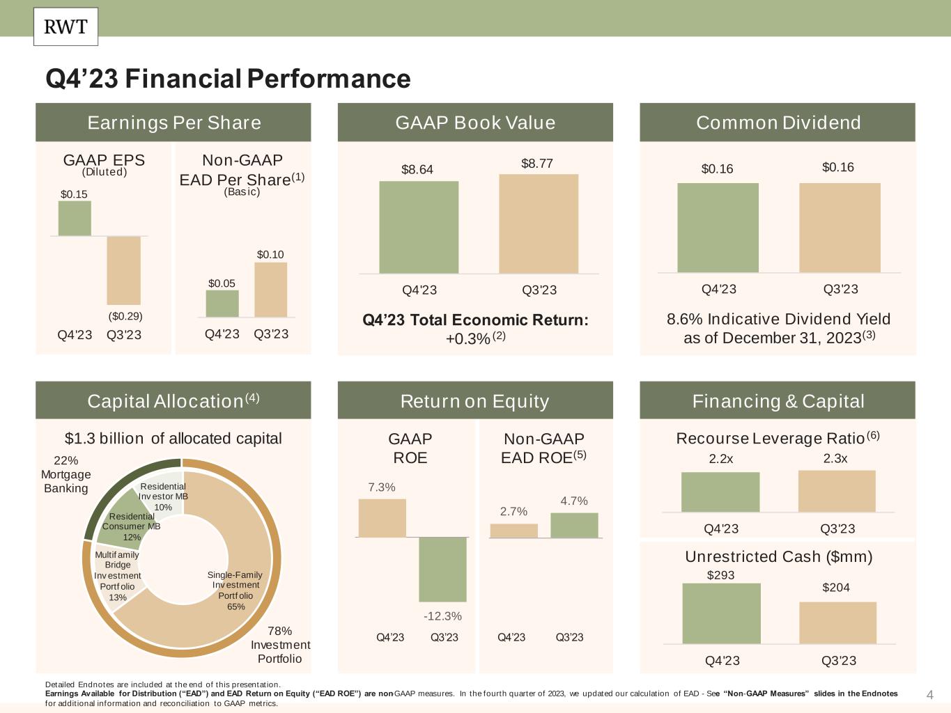 36 Note: We operate our business in three segments: Residential Consumer Mortgage Banking, Residential Investor Mortgage Banking, and Investment Portfolio. Prior to the fourth quarter of 2023, the Residential Consumer Mortgage Banking segment was named Residential Mortgage Banking and the Residential Investor Mortgage Banking segment was named Business Purpose Mortgage Banking. While segment names changed, no changes were made to the underlying composition of the segments. All appliable references in this document have been conformed to reflect the new segment names. Slide 3 (Redwood is a Full Spectrum Residential Housing Finance Platform) Source: Company financial data as of December 31, 2023 unless otherwise noted. 1. Allocated capital includes working capital and platform premium for mortgage banking operations and all investments net of associated debt for investment portfolio. Note, capital allocation excludes corporate capital and RWT Horizons. Further detail on the components of allocated capital is included in the Financial Results section of this presentation. 2. Annual Addressable Market Opportunity. Residential Consumer Mortgage Banking opportunity for Jumbo Lock Volume based on MBA Mortgage Finance Forecast for full year 2024 (as of January 19, 2024), estimated 15% share to jumbo production. Residential Consumer opportunity for Jumbo Loan Sales based on quantity of jumbo loans held on bank balance sheets (Source: JP Morgan Research). Residential Investor Mortgage Banking based on combined opportunity for SFR and Multifamily Rental. SFR based on December 2023 data and potential financing opportunity for SFR of $137 billion over 3-4 years (Source: John Burns Research and Consulting, LLC and internal Company estimates). Multifamily based on Freddie Mac 2024 multifamily origination estimate of $370 billion, adjusted for FNMA estimate of originations by non-traditional multifamily lenders. Investment Portfolio represents estimated investment opportunities across private label securities (“PLS”) subordinate securities, Credit Risk Transfer (“CRT”), HEI, Multifamily, Non-QM, NPL/RPL, Bridge and CAFL® SFR investments (Source: internal Company estimates). Endnotes Slide 4 (Q4’23 Financial Performance) Source: Company financial data as of December 31, 2023 unless otherwise noted. Market data per Bloomberg as of December 31, 2023. 1. Earnings Available for Distribution (“EAD”) is a non-GAAP measure. See slide in the Endnotes section of this presentation for additional information and reconciliation to GAAP net income. 2. Total economic return is based on the periodic change in GAAP book value per common share plus dividends declared per common share during the period, divided by beginning period GAAP book value per common share. 3. Indicative dividend yield based on RWT closing stock price of $7.41 on December 29, 2023. 4. Allocated capital includes working capital and platform premium for mortgage banking operations and all investments net of associated debt for investment portfolio. Capital allocation excludes corporate capital and RWT Horizons. Further detail on the components of allocated capital is included in the Financial Results section of this presentation. Single- Family Investment Portfolio capital allocation includes all capital allocated to the Investment Portfolio, including nominal amount of capital allocated to Freddie K-Series and CAFL securities with multifamily collateral and excluding capital allocated to Multifamily Bridge, which is depicted as its own sub-category on this chart. 5. EAD ROE is a non-GAAP metric. Please refer to Non-GAAP Measures in the Endnotes section of this presentation for additional information. 6. Recourse leverage ratio at December 31, 2023 is defined as recourse debt at Redwood exclusive of other liabilities, divided by tangible stockholders' equity. Recourse debt excludes $10.0 billion of consolidated securitization debt (ABS issued and servicer advance financing) $0.6 billion of other debt that is non-recourse to Redwood, and $0.2 billion of other liabilities, and tangible stockholders' equity excludes $52 million of goodwill and intangible assets.