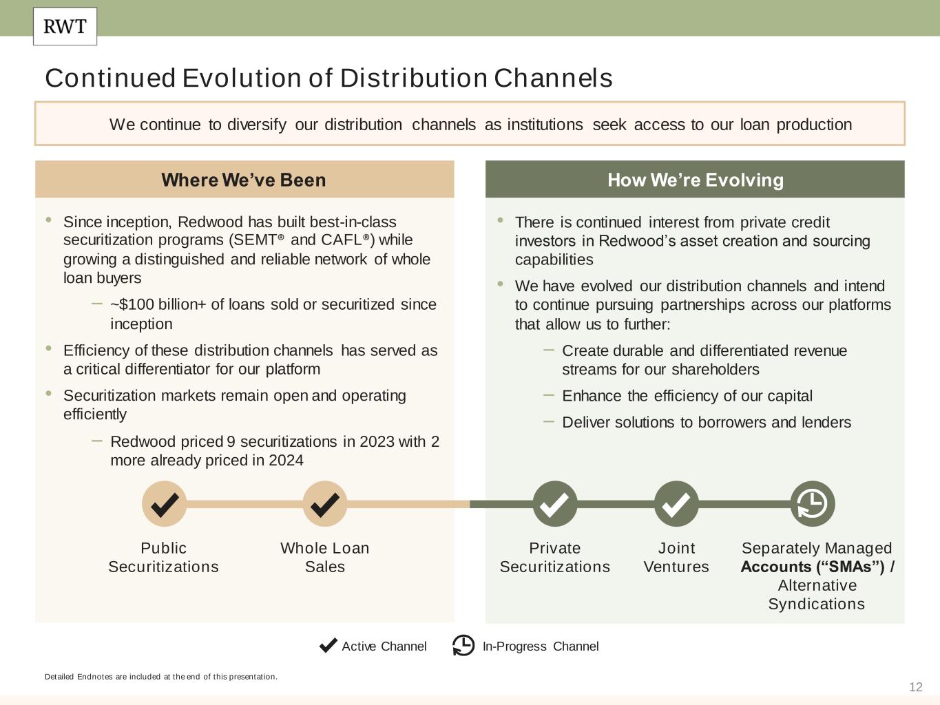 11 Robust Liquidity Supports Capital Deployment Opportunities Detailed Endnotes are included at the end of this presentation. With our elevated liquidity position, we see a number of attractive capital deployment opportunities $204 $192 $396 $185 $581 Unrestricted Cash 9/30/23 Change from 9/30/23 Unrestricted Cash 2/16/24 Potential Proceeds from Financing of Unencumbered Assets Total Available Cash and Potential Financing We have continued to grow our liquidity position and estimate we could generate an incremental $185 million of capital organically through financing of unencumbered assets Liquidity Overview Capital Deployment Opportunities(2) Mortgage Banking Organically Retained Securities & JV Co-Investments Opportunistic Debt Reduction Opportunistic Third-Party Investments 15-20%+ Current Illustrative Returns 12-18%+ Current Illustrative Returns 8-10%+ Current Illustrative Returns 15-20%+ Current Illustrative Returns (1) (2) 1 2 3 4 (2)