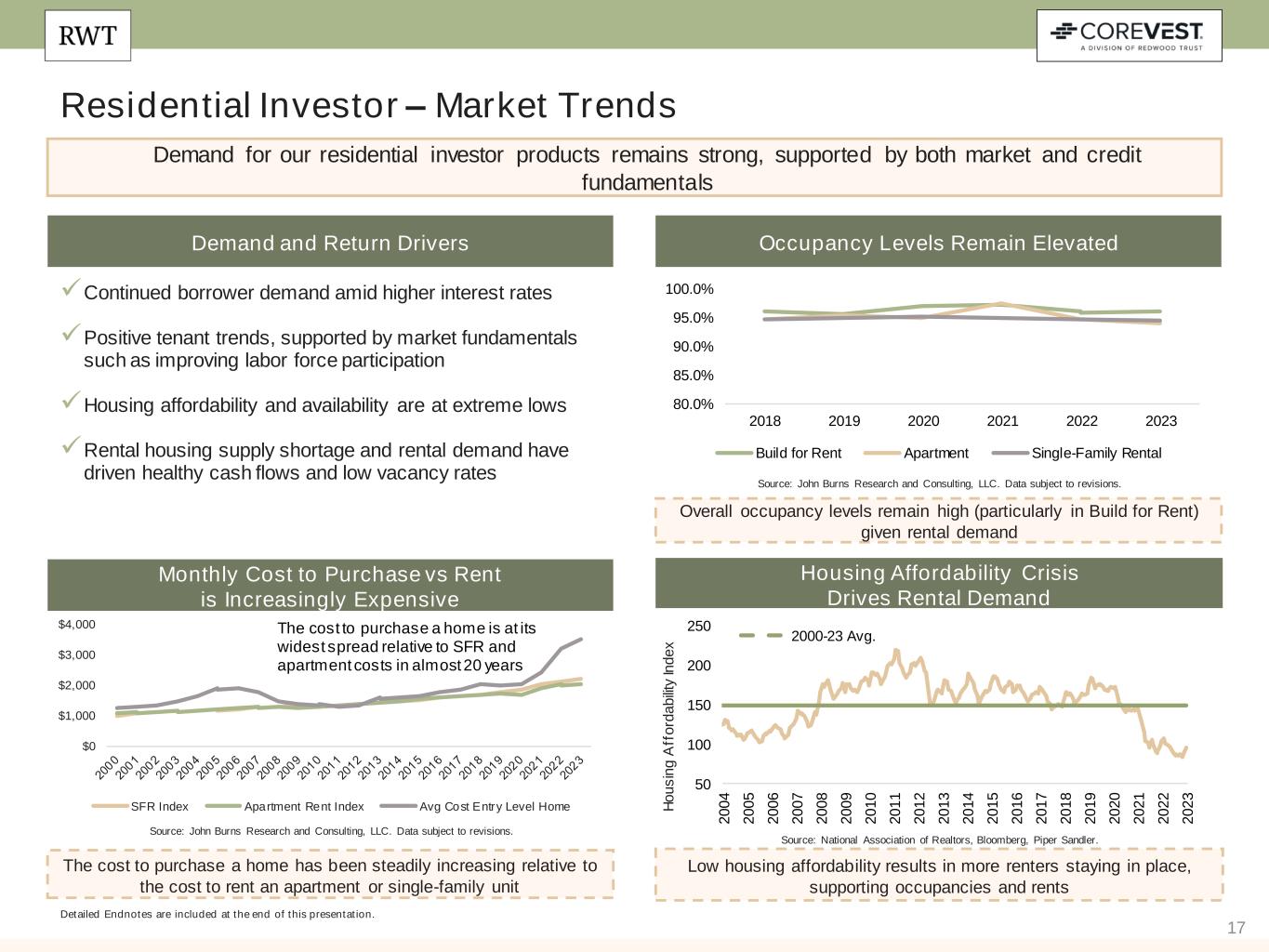 16 Residential Investor Mortgage Banking Q4’23 Quarterly Overview Composition of Q4’23 Quarterly Fundings(1) Detailed Endnotes are included at the end of this presentation. We remain focused on originating loans secured by assets with strong fundamentals and business plans with experienced sponsorship teams Term (34%) Bridge (66%) $343mm $135 $174 $129 $106 $117 $289 $264 $278 $305 $226 $424 $438 $406 $411 $343 Q4'22 Q1'23 Q2'23 Q3'23 Q4'23 Term Bridge Quarterly Funded Volume ($mm) • CoreVest funded $343 million of loans in Q4’23 (66% bridge / 34% term) – Term volumes increased 10% QoQ – Bridge volumes decreased 26% QoQ; maintained continued sponsor selectivity • Within bridge, single-asset bridge (“SAB”) loan volumes increased 30% QoQ as key sponsors re-entered the market • Segment profitability decreased QoQ as inventory pricing (which benefited from spread tightening in Q3’23) remained stable in the fourth quarter • Closed securitization backed by bridge loans with a 24-month revolving feature and up to $250 million of capacity • Distributed $111 million of loans through whole loan sales and sales to joint venture ("JV") participations • As rates stabilize or move lower, we expect increased demand from sponsors seeking fixed-rate bridge loans, or term loans with more prepayment flexibility Multifamily 11% Renovate / Build for Rent 35% SAB 20% Term 34%