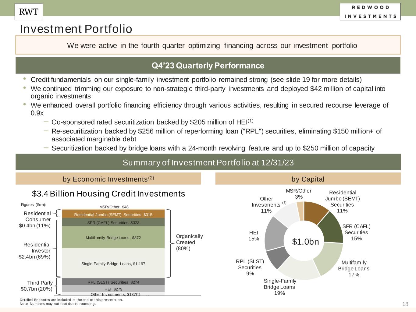 38 Endnotes Slide 18 (Investment Portfolio) Source: Company financial data as of December 31, 2023 unless otherwise noted. 1. Represents intrinsic value of total HEI collateralizing securitization, of which Redwood contributed approximately $75 million. Redwood retained approximately 40% of the total residual interests in the securitization. 2. Figures reflect our investments held in our Investment Portfolio on balance sheet and our economic interests in securities we own in securitizations we consolidate in accordance with GAAP (and excludes the assets within these consolidated securitizations that appear on our balance sheet) as of December 31, 2023. 3. $137 million of “Multifamily, CRT, and Other” includes $40 million net investment of multifamily securities, $6 million of third-party securities, and $91 million of other investments. Slide 19 (Single Family Residential Credit Fundamentals Remain Strong) Source: Company financial data as of December 31, 2023 unless otherwise noted. 1. Source: Bloomberg (HPI LTV (Amort) %), Home Price Indexed Amortized Loan to Value. 2. In the fourth quarter of 2023, the methodology for calculating delinquencies for RPL, Jumbo, CAFL, and Third-Party securities was updated to weight by notional balances of loans collateralizing each of our securities investments. All prior periods presented have been conformed to this updated methodology. Slide 20 (Potential Book Value Per Share Upside Driven by Underlying Asset Strength) Source: Company financial data as of December 31, 2023 unless otherwise noted. 1. Represents potential book value per share upside on our securities portfolio due to the net discount to par value, net of portfolio hedges. There are several factors that may impact our ability to realize all, or a portion, of this amount which may be outside our control, including credit performance and prepayment speeds. Actual realized book value returns may differ materially. 2. Represents the market value of subordinate securities at December 31, 2023 divided by the outstanding principal balance at December 31, 2023 as a dollar price per $100 par value. Slide 21 (Investment Portfolio – Residential Investor Bridge Loans Strategy) Source: Company financial data as of December 31, 2023 unless otherwise noted. 1. Table and total exclude Third Party Originated loans which represent only 2% of total bridge UPB at December 31, 2023. Slide 22 (Investment Portfolio – Residential Investor Bridge Loans Composition) Source: Company financial data as of December 31, 2023 unless otherwise noted. 1. Represents the market value of our bridge loans held for investment and held for sale at the time periods presented. Excludes REO loans. 2. Excludes REO loans. Slide 23 (Investment Portfolio – Residential Investor Bridge Loans Credit) Source: Company financial data as of December 31, 2023 unless otherwise noted. 1. Table and total exclude Third Party Originated loans which represent only 2% of total bridge UPB at December 31, 2023. Such Third Party Originated loans have average LTV at origination of 69.6%, average LTC at origination of 80.0%, weighted average coupon of 10.1%, average loan/facility size of $2.9mm, 90 day+ delinquency of 40.3% and REO of 22.2%. 2. Renovate / BFR REO comprised primarily of one BFR project which management expects to go under sale contract in Q1’24. Slide 24 (RWT Horizons) Source: Company financial data as of December 31, 2023 unless otherwise noted. Slide 26 (Appendix: Income Statement) 1. Net interest expense from “Corporate (unsecured debt)” consists primarily of interest expense on corporate unsecured debt as well as net interest income from Legacy Sequoia consolidated VIEs.