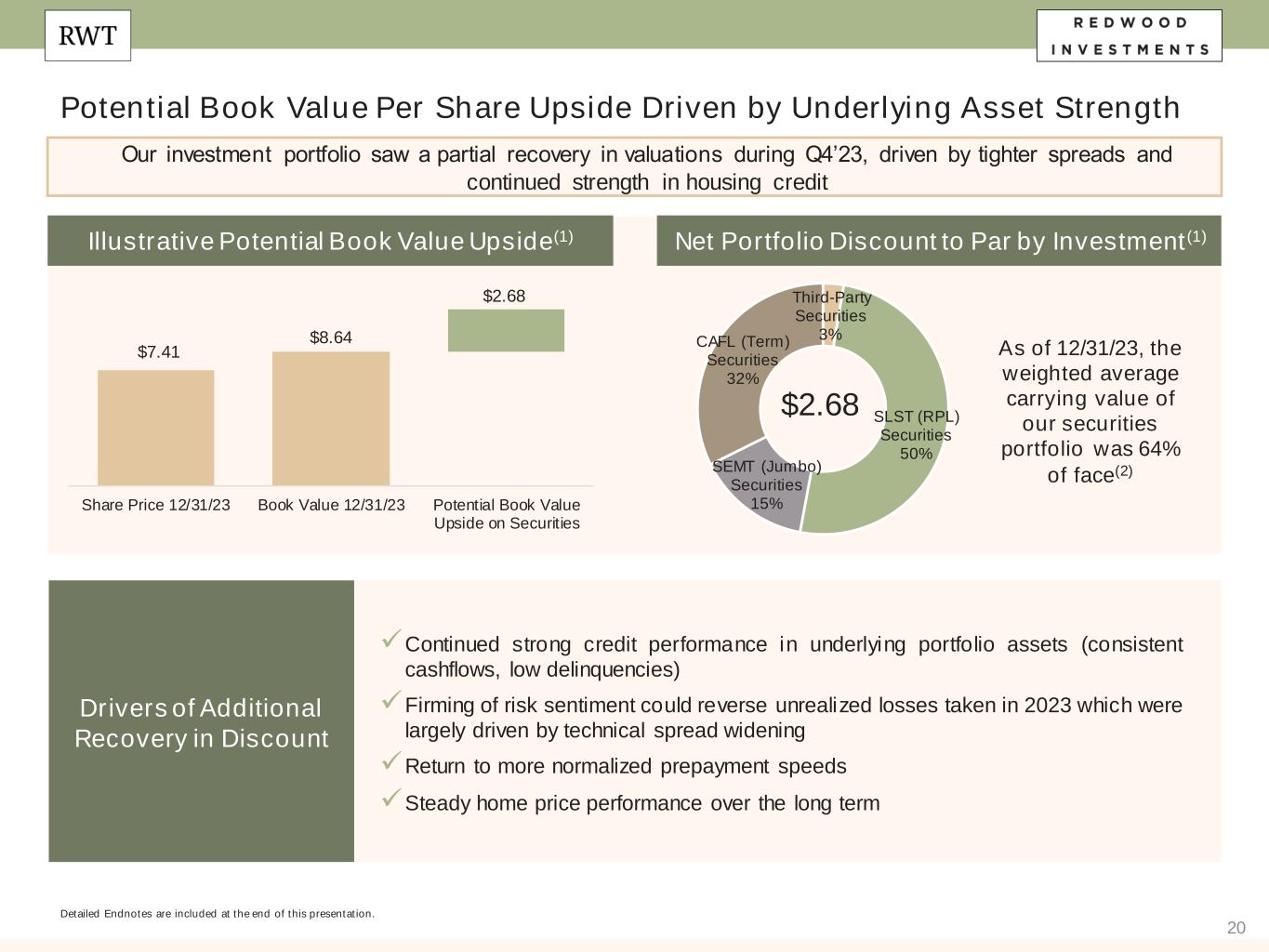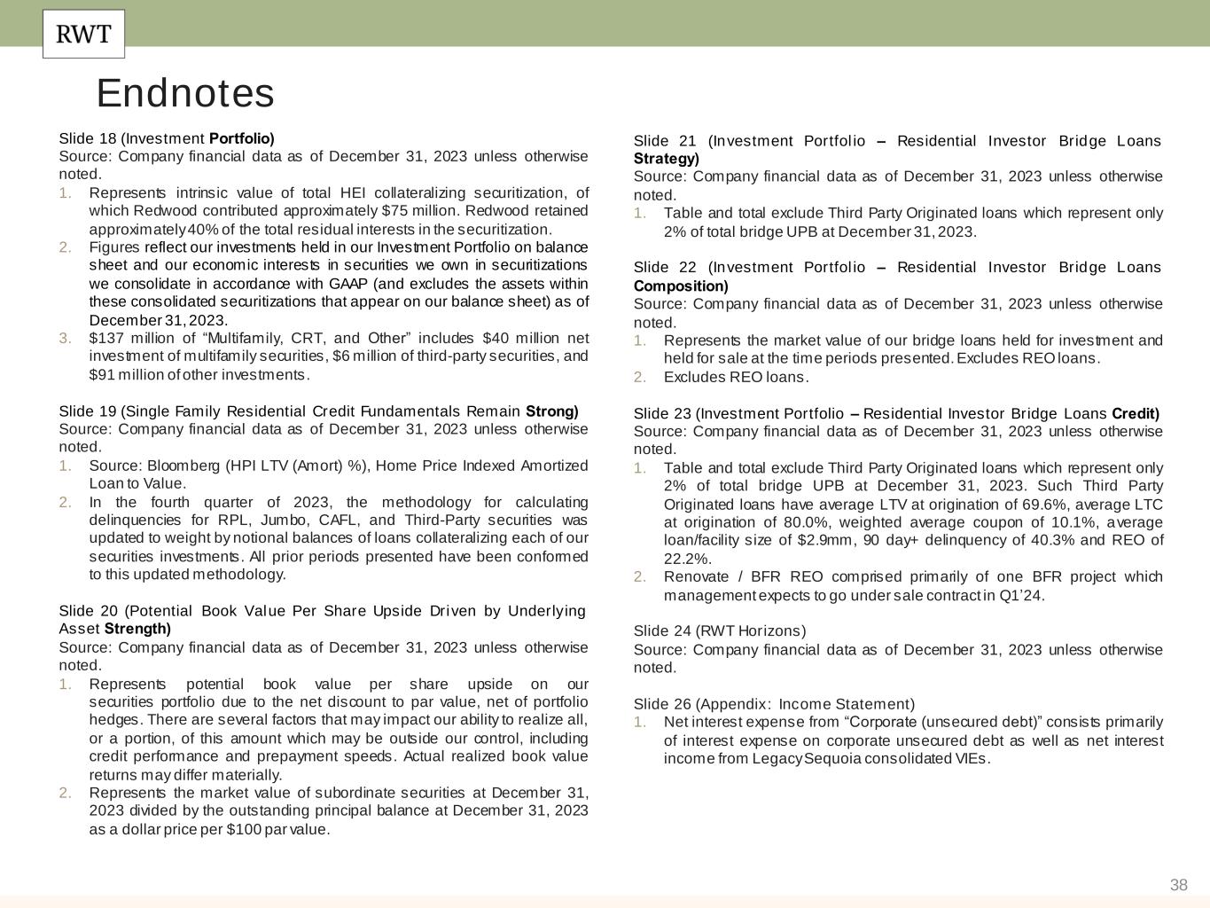 37 Endnotes Slide 5 (Q4’23 Business Performance) Source: Company financial data as of December 31, 2023 unless otherwise noted. 1. Lock volume represents loans identified for purchase from loan sellers. Lock volume does not account for potential fallout from pipeline that typically occurs through the lending process. 2. Includes Q1’24 activity through February 16, 2024. Slide 7 (2024 Positioning) Source: Company financial data as of December 31, 2023 unless otherwise noted. 1. Source: FDIC. Based on largest banks by assets. Excludes banks that do not have active mortgage origination platforms or that have been acquired. 2. Includes Q1’24 activity through February 16, 2024. 3. Represents potential book value per share upside on our securities portfolio due to the net discount to par value, net of portfolio hedges. There are several factors that may impact our ability to realize all, or a portion, of this amount which may be outside our control, including credit performance and prepayment speeds. Actual realized book value returns may differ materially. 4. Single-Family residential investments refers to all capital allocated to the Investment Portfolio, including nominal amount of capital allocated to Freddie K-Series and CAFL securities with multifamily collateral and excluding capital allocated to Multifamily Bridge. Slide 8 (Strategic Progress in Residential Consumer Mortgage Banking…) Source: Company financial data as of December 31, 2023 unless otherwise noted. 1. Redwood market share based on Redwood’s 2H’23 jumbo lock volume divided by 2H’23 industry jumbo lock volume (Source: Inside Mortgage Finance). 2. Source: Market share data based on Inside Mortgage Finance total jumbo origination production for top 50 jumbo loan originators Q1’21 through Q3’23. 3. Lock volume represents loans identified for purchase from loan sellers. Lock volume does not account for potential fallout from pipeline that typically occurs through the lending process. Slide 9 (…with Substantial Opportunity for Growth) 1. Represents management’s expectations and actual results may differ materially. 2. Source: JP Morgan Research, CoreLogic, Bank Filings and S&P. 3. Source: Data based on Inside Mortgage Finance total jumbo origination production Q1’21 through Q3’23. Slide 10 (Active Balance Sheet Management) Source: Company financial data as of December 31, 2023 unless otherwise noted. 1. Certain data within this timeline represents activities that occurred after December 31, 2023. Q1’24 represents activity through February 16, 2024. Slide 11 (Robust Liquidity Supports Capital Deployment Opportunities) Source: Company financial data as of December 31, 2023 unless otherwise noted. 1. Represents unrestricted cash and cash equivalent position as of February 16, 2024. 2. Represents management’s estimates and actual results may differ materially. Slide 12 (Continued Evolution of Distribution Channels) Source: Company financial data as of December 31, 2023 unless otherwise noted. Slide 15 (Residential Consumer Mortgage Banking) Source: Company financial data as of December 31, 2023 unless otherwise noted. 1. Lock volume represents loans identified for purchase from loan sellers. Lock volume does not account for potential fallout from pipeline that typically occurs through the lending process. 2. Includes Q1’24 activity through February 16, 2024. Slide 16 (Residential Investor Mortgage Banking) Source: Company financial data as of December 31, 2023 unless otherwise noted. 1. Composition percentages are based on unpaid principal balance.