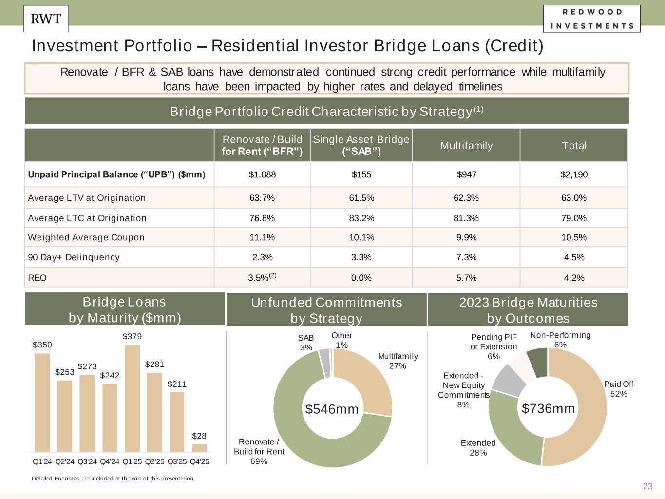 22 Investment Portfolio – Residential Investor Bridge Loans (Composition) Detailed Endnotes are included at the end of this presentation. Note: Composition percentages are based on unpaid principal balance. Bridge Portfolio Characteristics(1) Coupon Range Loan Geography (Top 10) Vintage (Origination Year) Loan Maturity Evolution of Bridge Portfolio(2) ▪ Since the end of 2022, we have strategically increased focus on single-family Renovate/BFR and SAB production ▪ Since Q4’22, 86% of total funded volume has been Renovate/BFR or SAB 0 - 6 Months 31% 7 - 12 Months 31% 13 - 18 Months 31% 19 - 24 Months 7% 2020 2% 2021 26% 1H'22 34% 2H'22 20% 2023 18% 16% GA 16% TX 11% IL 9% FL 6% CA 5% NJ 5% AL 5% LA 4% TN 3% OH We maintain a diversified portfolio of organically created bridge loans that has favored growth of Renovate / BFR production over the past year 1% 12% 48% 39% 1% 5-7% 7-9% 9-11% 11-13% 13%+ 51% 14% 42% 39% 67% 49% 6% 17% 7% 4% 2% 2% Q3'22 Cumulative Fundings Since Q4'22 Q4'23 Multifamily Renovate / Build for Rent SAB Other