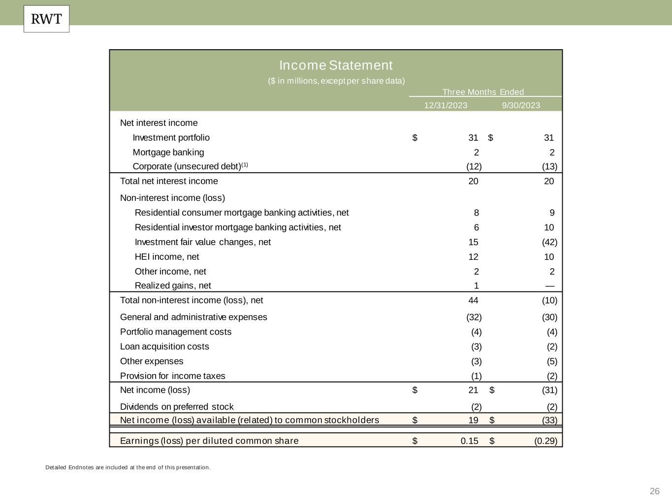 26 Detailed Endnotes are included at the end of this presentation. Income Statement ($ in millions, except per share data) Three Months Ended 12/31/2023 9/30/2023 Net interest income Investment portfolio $ 31 $ 31 Mortgage banking 2 2 Corporate (unsecured debt)(1) (12) (13) Total net interest income 20 20 Non-interest income (loss) Residential consumer mortgage banking activities, net 8 9 Residential investor mortgage banking activities, net 6 10 Investment fair value changes, net 15 (42) HEI income, net 12 10 Other income, net 2 2 Realized gains, net 1 — Total non-interest income (loss), net 44 (10) General and administrative expenses (32) (30) Portfolio management costs (4) (4) Loan acquisition costs (3) (2) Other expenses (3) (5) Provision for income taxes (1) (2) Net income (loss) $ 21 $ (31) Dividends on preferred stock (2) (2) Net income (loss) available (related) to common stockholders $ 19 $ (33) Earnings (loss) per diluted common share $ 0.15 $ (0.29)