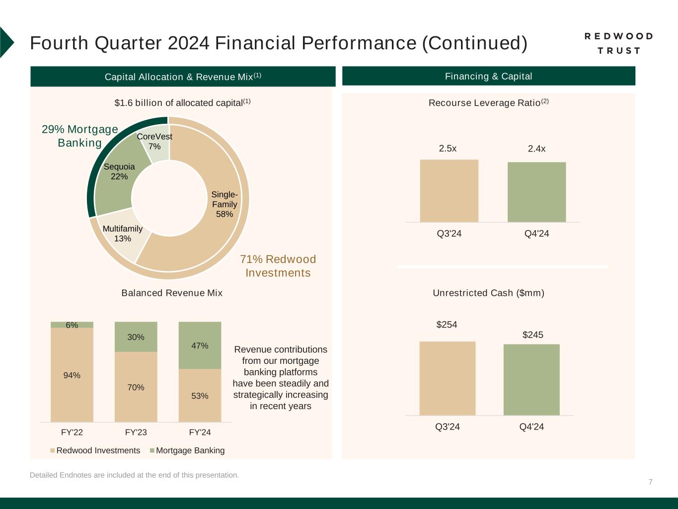 6 Detailed Endnotes are included at the end of this presentation. *Earnings Available for Distribution (“EAD”) and EAD Return on Equity (“EAD ROE”) are non-GAAP measures. See “Non-GAAP Measures” slides in the Endnotes for additional information and reconciliation to GAAP metrics. Fourth Quarter 2024 Financial Performance Q4’24 Total Economic Return: (1.1%)%(1) 11.0% Indicative Dividend Yield as of December 31, 2024(2) GAAP ROE Non-GAAP EAD ROE* GAAP EPS Non-GAAP EAD Per Share* Earnings Per Share GAAP Book Value Per Share Common Dividend Per Share Return on Equity $0.09 ($0.07) Q3'24 Q4'24 $0.18 $0.13 Q3'24 Q4'24 $8.74 $8.46 Q3'24 Q4'24 $0.17 $0.18 Q3'24 Q4'24 8.7% 6.6% Q3'24 Q4'24 4.5% (3.0%) Q3'24 Q4'24