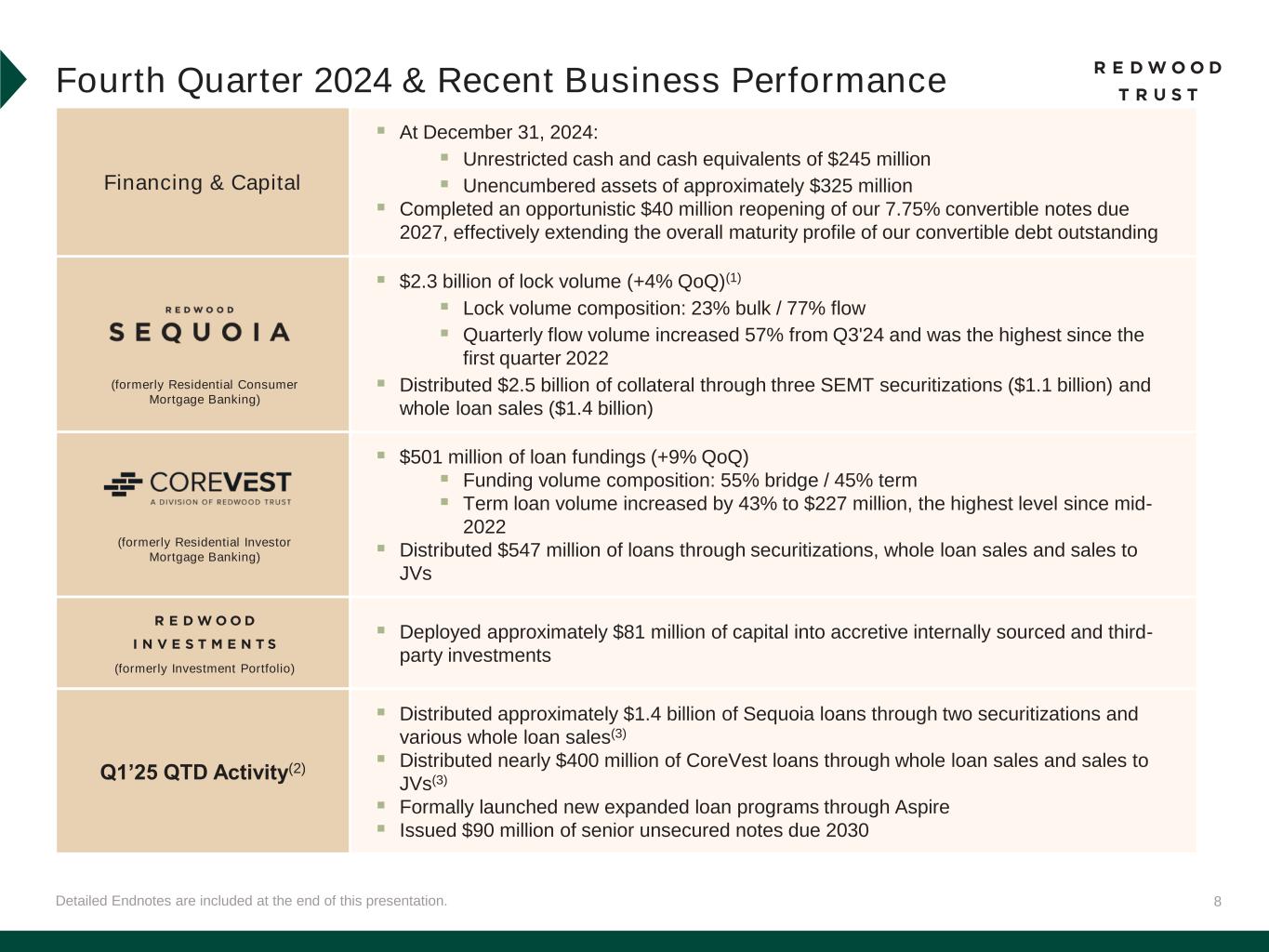 7 Single- Family 58% Multifamily 13% Sequoia 22% CoreVest 7% Detailed Endnotes are included at the end of this presentation. Fourth Quarter 2024 Financial Performance (Continued) Recourse Leverage Ratio(2) Capital Allocation & Revenue Mix(1) Financing & Capital 29% Mortgage Banking Unrestricted Cash ($mm) $1.6 billion of allocated capital(1) 71% Redwood Investments Balanced Revenue Mix $254 $245 Q3'24 Q4'24 2.5x 2.4x Q3'24 Q4'24 Revenue contributions from our mortgage banking platforms have been steadily and strategically increasing in recent years 94% 70% 53% 6% 30% 47% FY'22 FY'23 FY'24 Redwood Investments Mortgage Banking