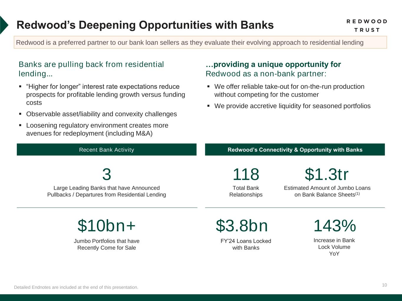 9 Aspire Expanded Programs Address Growing Market Demand In January 2025, we announced the formal launch of new Aspire loan programs to meet the growing borrower demand Broadened mandate designed to meet growing consumer need for flexible financing solutions ▪ Represents large and growing addressable market ▪ Provides additional revenue streams to Redwood ▪ Supports our existing seller base with new products as overall volumes remain pressured ▪ Addresses deep demand from our investors (securitization and whole loan) who are interested in these products ▪ Presents opportunity to disrupt production processes via automation and AI ▪ Leverages our leadership role in providing quality solutions to the housing market Detailed Endnotes are included at the end of this presentation. 12.00 14.00 16.00 18.00 2 0 1 3 2 0 1 4 2 0 1 5 2 0 1 6 2 0 1 7 2 0 1 8 2 0 1 9 2 0 2 0 2 0 2 1 2 0 2 2 2 0 2 3 2 0 2 4 S e lf -E m p lo y e d A m e ri c a n s ( m m ) Ongoing Strength in Expanded Securitization Issuance(1) Elevated Number of Self-Employed Borrowers(2) ($ b n ) 0 2 4 6 8 10 12 14 16 Jan '15 Jul '16 Jan '18 Jul '19 Jan '21 Jul '22 Jan '24 Net MF completions (mn, vs. 2015) Net SF completions (mn, vs. 2015) Net households (mn, vs. 2015) U n it s m m Market Trends Supporting Expanded Product Opportunity Undersupply of Housing(1) $1 $4 $14 $29 $21 $31 $41 $31 $46 2016 2017 2018 2019 2020 2021 2022 2023 2024