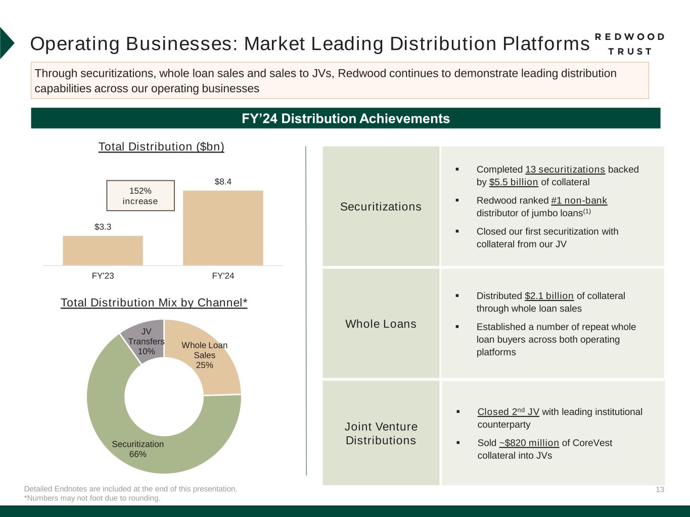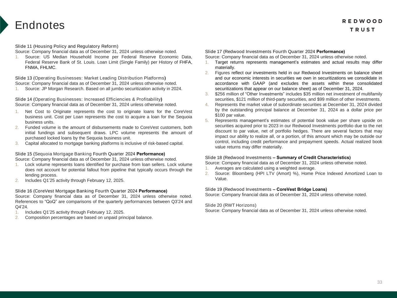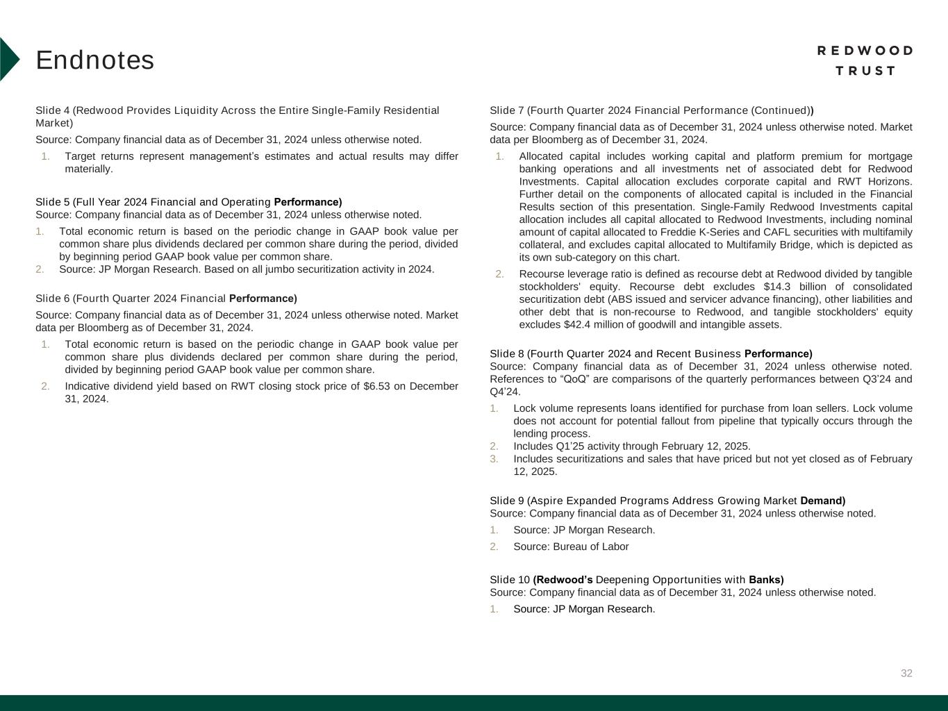 32 Slide 4 (Redwood Provides Liquidity Across the Entire Single-Family Residential Market) Source: Company financial data as of December 31, 2024 unless otherwise noted. 1. Target returns represent management’s estimates and actual results may differ materially. Slide 5 (Full Year 2024 Financial and Operating Performance) Source: Company financial data as of December 31, 2024 unless otherwise noted. 1. Total economic return is based on the periodic change in GAAP book value per common share plus dividends declared per common share during the period, divided by beginning period GAAP book value per common share. 2. Source: JP Morgan Research. Based on all jumbo securitization activity in 2024. Slide 6 (Fourth Quarter 2024 Financial Performance) Source: Company financial data as of December 31, 2024 unless otherwise noted. Market data per Bloomberg as of December 31, 2024. 1. Total economic return is based on the periodic change in GAAP book value per common share plus dividends declared per common share during the period, divided by beginning period GAAP book value per common share. 2. Indicative dividend yield based on RWT closing stock price of $6.53 on December 31, 2024. Slide 7 (Fourth Quarter 2024 Financial Performance (Continued)) Source: Company financial data as of December 31, 2024 unless otherwise noted. Market data per Bloomberg as of December 31, 2024. 1. Allocated capital includes working capital and platform premium for mortgage banking operations and all investments net of associated debt for Redwood Investments. Capital allocation excludes corporate capital and RWT Horizons. Further detail on the components of allocated capital is included in the Financial Results section of this presentation. Single-Family Redwood Investments capital allocation includes all capital allocated to Redwood Investments, including nominal amount of capital allocated to Freddie K-Series and CAFL securities with multifamily collateral, and excludes capital allocated to Multifamily Bridge, which is depicted as its own sub-category on this chart. 2. Recourse leverage ratio is defined as recourse debt at Redwood divided by tangible stockholders' equity. Recourse debt excludes $14.3 billion of consolidated securitization debt (ABS issued and servicer advance financing), other liabilities and other debt that is non-recourse to Redwood, and tangible stockholders' equity excludes $42.4 million of goodwill and intangible assets. Slide 8 (Fourth Quarter 2024 and Recent Business Performance) Source: Company financial data as of December 31, 2024 unless otherwise noted. References to “QoQ” are comparisons of the quarterly performances between Q3’24 and Q4’24. 1. Lock volume represents loans identified for purchase from loan sellers. Lock volume does not account for potential fallout from pipeline that typically occurs through the lending process. 2. Includes Q1’25 activity through February 12, 2025. 3. Includes securitizations and sales that have priced but not yet closed as of February 12, 2025. Slide 9 (Aspire Expanded Programs Address Growing Market Demand) Source: Company financial data as of December 31, 2024 unless otherwise noted. 1. Source: JP Morgan Research. 2. Source: Bureau of Labor Slide 10 (Redwood’s Deepening Opportunities with Banks) Source: Company financial data as of December 31, 2024 unless otherwise noted. 1. Source: JP Morgan Research. Endnotes