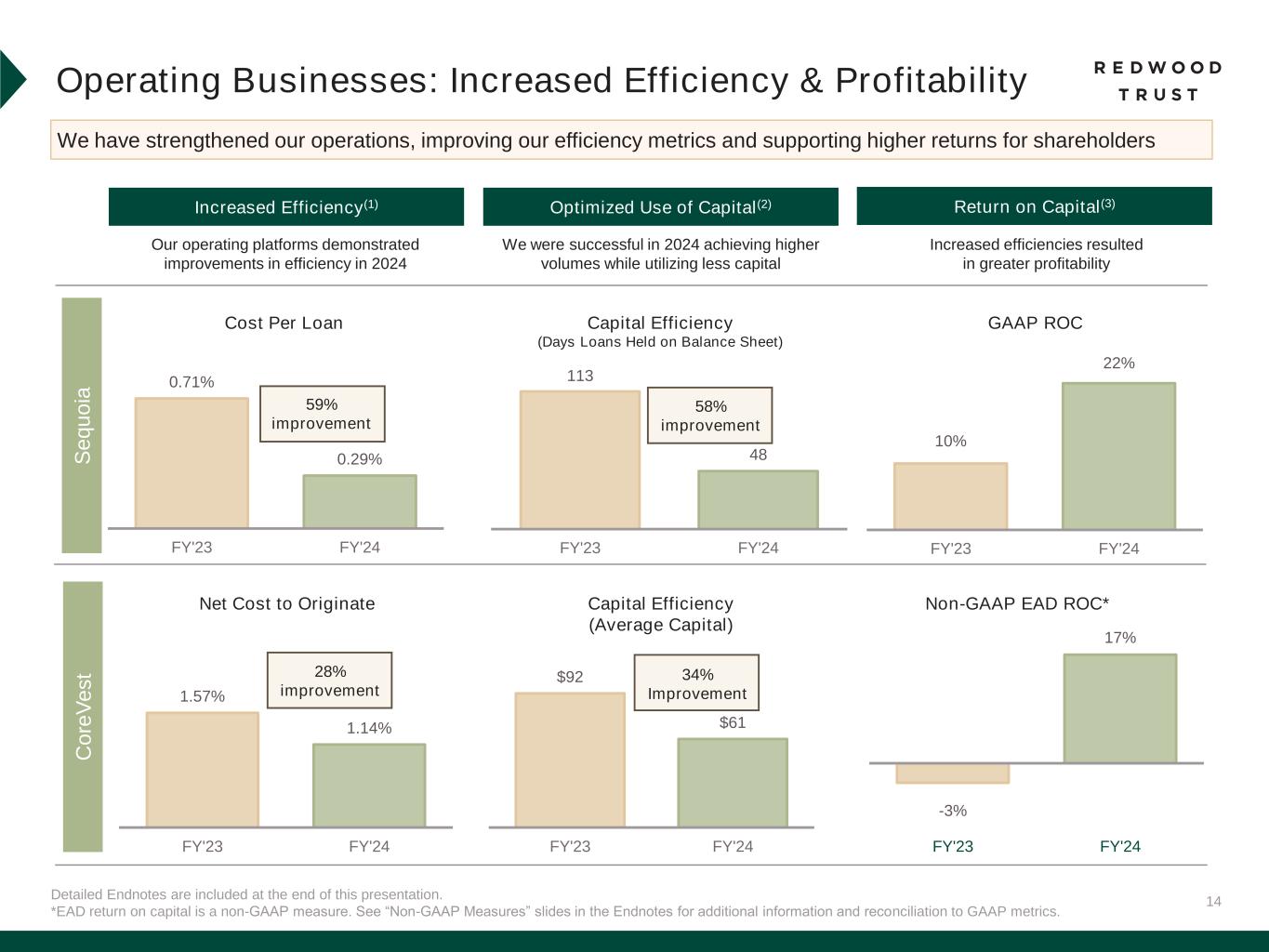 14 113 48 FY'23 FY'24 Detailed Endnotes are included at the end of this presentation. *EAD return on capital is a non-GAAP measure. See “Non-GAAP Measures” slides in the Endnotes for additional information and reconciliation to GAAP metrics. Operating Businesses: Increased Efficiency & Profitability We have strengthened our operations, improving our efficiency metrics and supporting higher returns for shareholders Optimized Use of Capital(2)Increased Efficiency(1) Cost Per Loan Our operating platforms demonstrated improvements in efficiency in 2024 We were successful in 2024 achieving higher volumes while utilizing less capital 0.71% 0.29% FY'23 FY'24 Capital Efficiency (Days Loans Held on Balance Sheet) Return on Capital(3) 10% 22% FY'23 FY'24 GAAP ROC Increased efficiencies resulted in greater profitability S e q u o ia Capital Efficiency (Average Capital) 1.57% 1.14% FY'23 FY'24 Net Cost to Originate $92 $61 FY'23 FY'24 -3% 17% FY'23 FY'24 Non-GAAP EAD ROC* C o re V e s t 59% improvement 34% Improvement 58% improvement 28% improvement