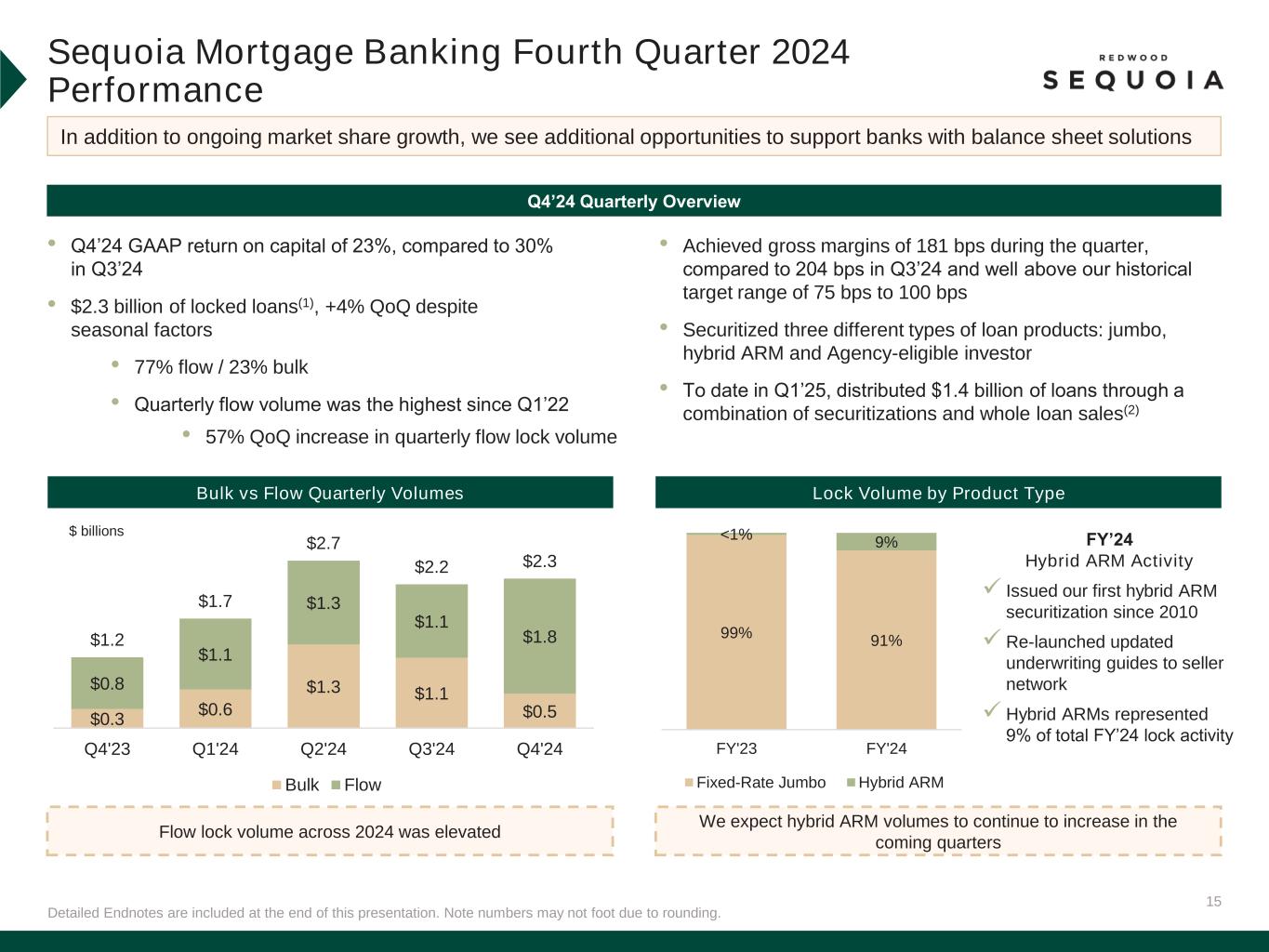 15 Detailed Endnotes are included at the end of this presentation. Note numbers may not foot due to rounding. Sequoia Mortgage Banking Fourth Quarter 2024 Performance Q4’24 Quarterly Overview Lock Volume by Product TypeBulk vs Flow Quarterly Volumes In addition to ongoing market share growth, we see additional opportunities to support banks with balance sheet solutions $ billions Flow lock volume across 2024 was elevated We expect hybrid ARM volumes to continue to increase in the coming quarters FY’24 Hybrid ARM Activity ✓ Issued our first hybrid ARM securitization since 2010 ✓ Re-launched updated underwriting guides to seller network ✓ Hybrid ARMs represented 9% of total FY’24 lock activity $0.3 $0.6 $1.3 $1.1 $0.5 $0.8 $1.1 $1.3 $1.1 $1.8 $1.2 $1.7 $2.7 $2.2 $2.3 Q4'23 Q1'24 Q2'24 Q3'24 Q4'24 Bulk Flow 99% 91% <1% 9% FY'23 FY'24 Fixed-Rate Jumbo Hybrid ARM • Q4’24 GAAP return on capital of 23%, compared to 30% in Q3’24 • $2.3 billion of locked loans(1), +4% QoQ despite seasonal factors • 77% flow / 23% bulk • Quarterly flow volume was the highest since Q1’22 • 57% QoQ increase in quarterly flow lock volume • Achieved gross margins of 181 bps during the quarter, compared to 204 bps in Q3’24 and well above our historical target range of 75 bps to 100 bps • Securitized three different types of loan products: jumbo, hybrid ARM and Agency-eligible investor • To date in Q1’25, distributed $1.4 billion of loans through a combination of securitizations and whole loan sales(2)