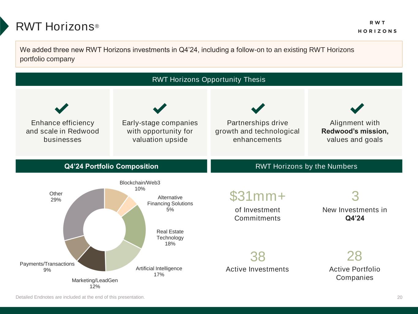 20Detailed Endnotes are included at the end of this presentation. RWT Horizons® We added three new RWT Horizons investments in Q4’24, including a follow-on to an existing RWT Horizons portfolio company RWT Horizons by the Numbers RWT Horizons Opportunity Thesis Enhance efficiency and scale in Redwood businesses Early-stage companies with opportunity for valuation upside Partnerships drive growth and technological enhancements Alignment with Redwood’s mission, values and goals Q4’24 Portfolio Composition of Investment Commitments $31mm+ 3 New Investments in Q4’24 38 Active Investments 28 Active Portfolio Companies Blockchain/Web3 10% Alternative Financing Solutions 5% Real Estate Technology 18% Artificial Intelligence 17% Marketing/LeadGen 12% Payments/Transactions 9% Other 29%