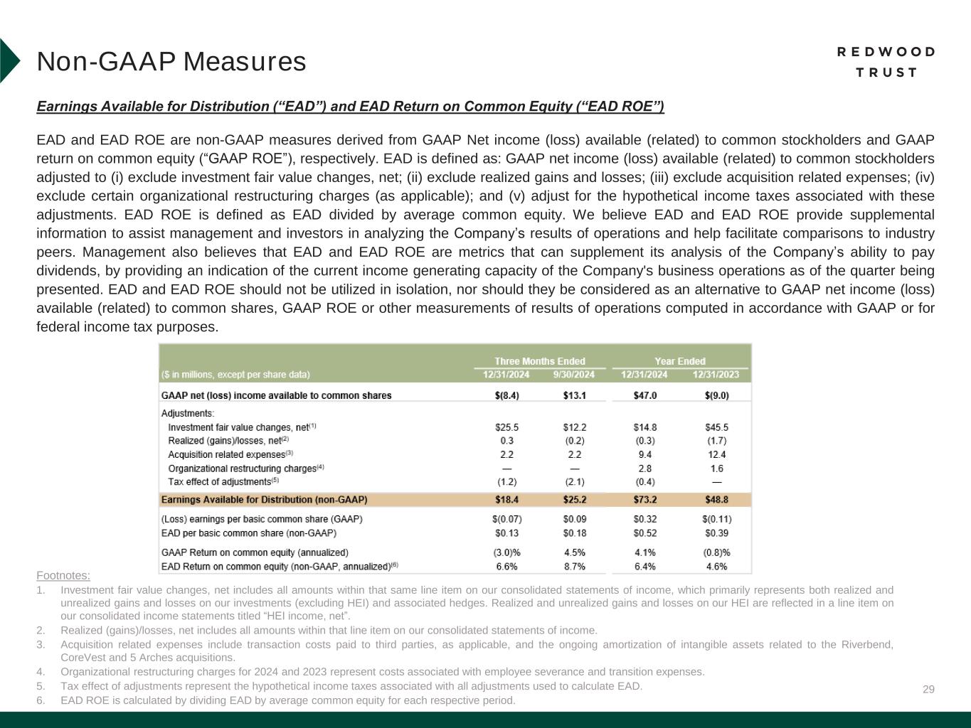 29 Earnings Available for Distribution (“EAD”) and EAD Return on Common Equity (“EAD ROE”) EAD and EAD ROE are non-GAAP measures derived from GAAP Net income (loss) available (related) to common stockholders and GAAP return on common equity (“GAAP ROE”), respectively. EAD is defined as: GAAP net income (loss) available (related) to common stockholders adjusted to (i) exclude investment fair value changes, net; (ii) exclude realized gains and losses; (iii) exclude acquisition related expenses; (iv) exclude certain organizational restructuring charges (as applicable); and (v) adjust for the hypothetical income taxes associated with these adjustments. EAD ROE is defined as EAD divided by average common equity. We believe EAD and EAD ROE provide supplemental information to assist management and investors in analyzing the Company’s results of operations and help facilitate comparisons to industry peers. Management also believes that EAD and EAD ROE are metrics that can supplement its analysis of the Company’s ability to pay dividends, by providing an indication of the current income generating capacity of the Company's business operations as of the quarter being presented. EAD and EAD ROE should not be utilized in isolation, nor should they be considered as an alternative to GAAP net income (loss) available (related) to common shares, GAAP ROE or other measurements of results of operations computed in accordance with GAAP or for federal income tax purposes. Footnotes: 1. Investment fair value changes, net includes all amounts within that same line item on our consolidated statements of income, which primarily represents both realized and unrealized gains and losses on our investments (excluding HEI) and associated hedges. Realized and unrealized gains and losses on our HEI are reflected in a line item on our consolidated income statements titled “HEI income, net”. 2. Realized (gains)/losses, net includes all amounts within that line item on our consolidated statements of income. 3. Acquisition related expenses include transaction costs paid to third parties, as applicable, and the ongoing amortization of intangible assets related to the Riverbend, CoreVest and 5 Arches acquisitions. 4. Organizational restructuring charges for 2024 and 2023 represent costs associated with employee severance and transition expenses. 5. Tax effect of adjustments represent the hypothetical income taxes associated with all adjustments used to calculate EAD. 6. EAD ROE is calculated by dividing EAD by average common equity for each respective period. Non-GAAP Measures