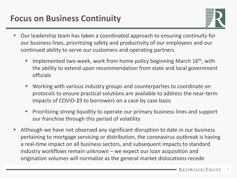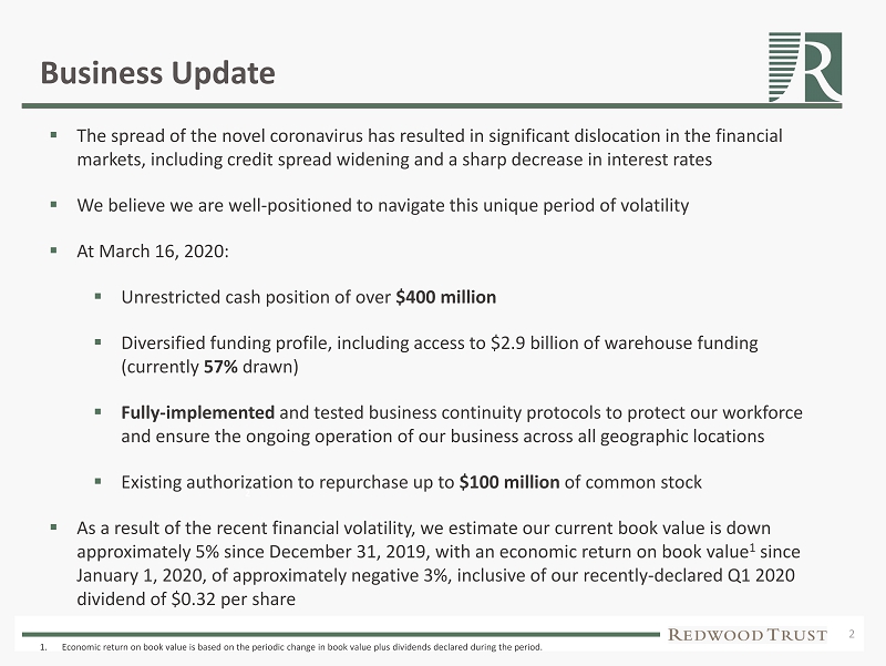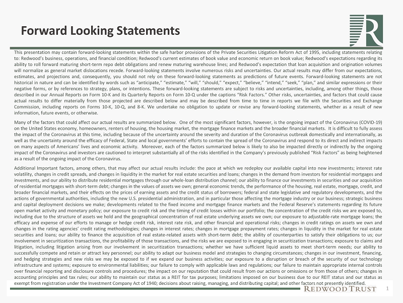 1 Forward Looking Statements This presentation may contain forward - looking statements within the safe harbor provisions of the Private Securities Litigation Reform Act of 1995 , including statements relating to : Redwood’s business, operations, and financial condition ; Redwood’s current estimates of book value and economic return on book value ; Redwood’s expectations regarding its ability to roll forward maturing short - term repo debt obligations and renew maturing warehouse lines ; and Redwood’s expectation that loan acquisition and origination volumes will normalize as general market dislocations recede . Forward - looking statements involve numerous risks and uncertainties . Our actual results may differ from our expectations, estimates, and projections and, consequently, you should not rely on these forward - looking statements as predictions of future events . Forward - looking statements are not historical in nature and can be identified by words such as “anticipate,” “estimate,” “will,” “should,” “expect,” “believe,” “intend,” “seek,” “plan,” and similar expressions or their negative forms, or by references to strategy, plans, or intentions . These forward - looking statements are subject to risks and uncertainties, including, among other things, those described in our Annual Reports on Form 10 - K and its Quarterly Reports on Form 10 - Q under the captions “Risk Factors . ” Other risks, uncertainties, and factors that could cause actual results to differ materially from those projected are described below and may be described from time to time in reports we file with the Securities and Exchange Commission, including reports on Forms 10 - K, 10 - Q, and 8 - K . We undertake no obligation to update or revise any forward - looking statements, whether as a result of new information, future events, or otherwise . Many of the factors that could affect our actual results are summarized below . One of the most significant factors, however, is the ongoing impact of the Coronavirus (COVID - 19 ) on the United States economy, homeowners, renters of housing, the housing market, the mortgage finance markets and the broader financial markets . It is difficult to fully assess the impact of the Coronavirus at this time, including because of the uncertainty around the severity and duration of the Coronavirus outbreak domestically and internationally, as well as the uncertainty around the efficacy of Federal, State and local governments’ efforts to contain the spread of the Coronavirus and respond to its direct and indirect impacts on many aspects of Americans’ lives and economic activity . Moreover, each of the factors summarized below is likely to also be impacted directly or indirectly by the ongoing impact of the Coronavirus and investors are cautioned to interpret substantially all of the risks identified in the Company’s previously published “Risk Factors” as being heightened as a result of the ongoing impact of the Coronavirus . Additional Important factors, among others, that may affect our actual results include : the pace at which we redeploy our available capital into new investments ; interest rate volatility, changes in credit spreads, and changes in liquidity in the market for real estate securities and loans ; changes in the demand from investors for residential mortgages and investments, and our ability to distribute residential mortgages through our whole - loan distribution channel ; our ability to finance our investments in securities and our acquisition of residential mortgages with short - term debt ; changes in the values of assets we own ; general economic trends, the performance of the housing, real estate, mortgage, credit, and broader financial markets, and their effects on the prices of earning assets and the credit status of borrowers ; federal and state legislative and regulatory developments, and the actions of governmental authorities, including the new U . S . presidential administration, and in particular those affecting the mortgage industry or our business ; strategic business and capital deployment decisions we make ; developments related to the fixed income and mortgage finance markets and the Federal Reserve’s statements regarding its future open market activity and monetary policy ; our exposure to credit risk and the timing of credit losses within our portfolio ; the concentration of the credit risks we are exposed to, including due to the structure of assets we hold and the geographical concentration of real estate underlying assets we own ; our exposure to adjustable - rate mortgage loans ; the efficacy and expense of our efforts to manage or hedge credit risk, interest rate risk, and other financial and operational risks ; changes in credit ratings on assets we own and changes in the rating agencies’ credit rating methodologies ; changes in interest rates ; changes in mortgage prepayment rates ; changes in liquidity in the market for real estate securities and loans ; our ability to finance the acquisition of real estate - related assets with short - term debt ; the ability of counterparties to satisfy their obligations to us ; our involvement in securitization transactions, the profitability of those transactions, and the risks we are exposed to in engaging in securitization transactions ; exposure to claims and litigation, including litigation arising from our involvement in securitization transactions ; whether we have sufficient liquid assets to meet short - term needs ; our ability to successfully compete and retain or attract key personnel ; our ability to adapt our business model and strategies to changing circumstances ; changes in our investment, financing, and hedging strategies and new risks we may be exposed to if we expand our business activities ; our exposure to a disruption or breach of the security of our technology infrastructure and systems ; exposure to environmental li