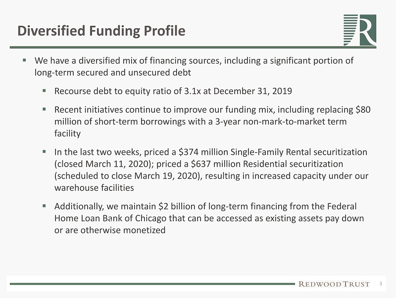 2 Business Update ▪ The spread of the novel coronavirus has resulted in significant dislocation in the financial markets, including credit spread widening and a sharp decrease in interest rates ▪ We believe we are well - positioned to navigate this unique period of volatility ▪ At March 16, 2020: ▪ Unrestricted cash position of over $400 million ▪ Diversified funding profile, including access to $2.9 billion of warehouse funding (currently 57% drawn) ▪ Fully - implemented and tested business continuity protocols to protect our workforce and ensure the ongoing operation of our business across all geographic locations ▪ Existing authorization to repurchase up to $100 million of common stock ▪ As a result of the recent financial volatility, we estimate our current book value is down approximately 5% since December 31, 2019, with an economic return on book value 1 since January 1, 2020, of approximately negative 3%, inclusive of our recently - declared Q1 2020 dividend of $0.32 per share 2 1. Economic return on book value is based on the periodic change in book value plus dividends declared during the period.