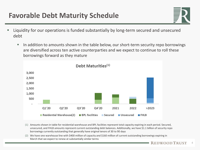 3 Diversified Funding Profile ▪ We have a diversified mix of financing sources, including a significant portion of long - term secured and unsecured debt ▪ Recourse debt to equity ratio of 3.1x at December 31, 2019 ▪ Recent initiatives continue to improve our funding mix, including replacing $80 million of short - term borrowings with a 3 - year non - mark - to - market term facility ▪ In the last two weeks, priced a $374 million Single - Family Rental securitization (closed March 11, 2020); priced a $637 million Residential securitization (scheduled to close March 19, 2020), resulting in increased capacity under our warehouse facilities ▪ Additionally, we maintain $2 billion of long - term financing from the Federal Home Loan Bank of Chicago that can be accessed as existing assets pay down or are otherwise monetized 2