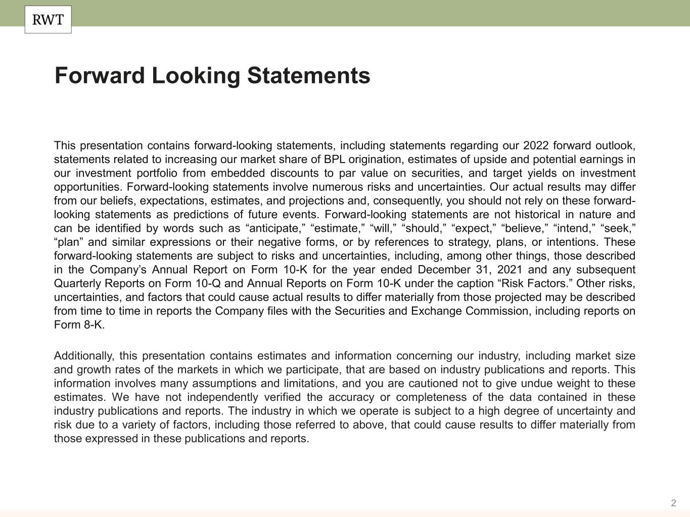 2 Forward Looking Statements This presentation contains forward-looking statements, including statements regarding our 2022 forward outlook, statements related to increasing our market share of BPL origination, estimates of upside and potential earnings in our investment portfolio from embedded discounts to par value on securities, and target yields on investment opportunities. Forward-looking statements involve numerous risks and uncertainties. Our actual results may differ from our beliefs, expectations, estimates, and projections and, consequently, you should not rely on these forward- looking statements as predictions of future events. Forward-looking statements are not historical in nature and can be identified by words such as “anticipate,” “estimate,” “will,” “should,” “expect,” “believe,” “intend,” “seek,” “plan” and similar expressions or their negative forms, or by references to strategy, plans, or intentions. These forward-looking statements are subject to risks and uncertainties, including, among other things, those described in the Company’s Annual Report on Form 10-K for the year ended December 31, 2021 and any subsequent Quarterly Reports on Form 10-Q and Annual Reports on Form 10-K under the caption “Risk Factors.” Other risks, uncertainties, and factors that could cause actual results to differ materially from those projected may be described from time to time in reports the Company files with the Securities and Exchange Commission, including reports on Form 8-K. Additionally, this presentation contains estimates and information concerning our industry, including market size and growth rates of the markets in which we participate, that are based on industry publications and reports. This information involves many assumptions and limitations, and you are cautioned not to give undue weight to these estimates. We have not independently verified the accuracy or completeness of the data contained in these industry publications and reports. The industry in which we operate is subject to a high degree of uncertainty and risk due to a variety of factors, including those referred to above, that could cause results to differ materially from those expressed in these publications and reports.