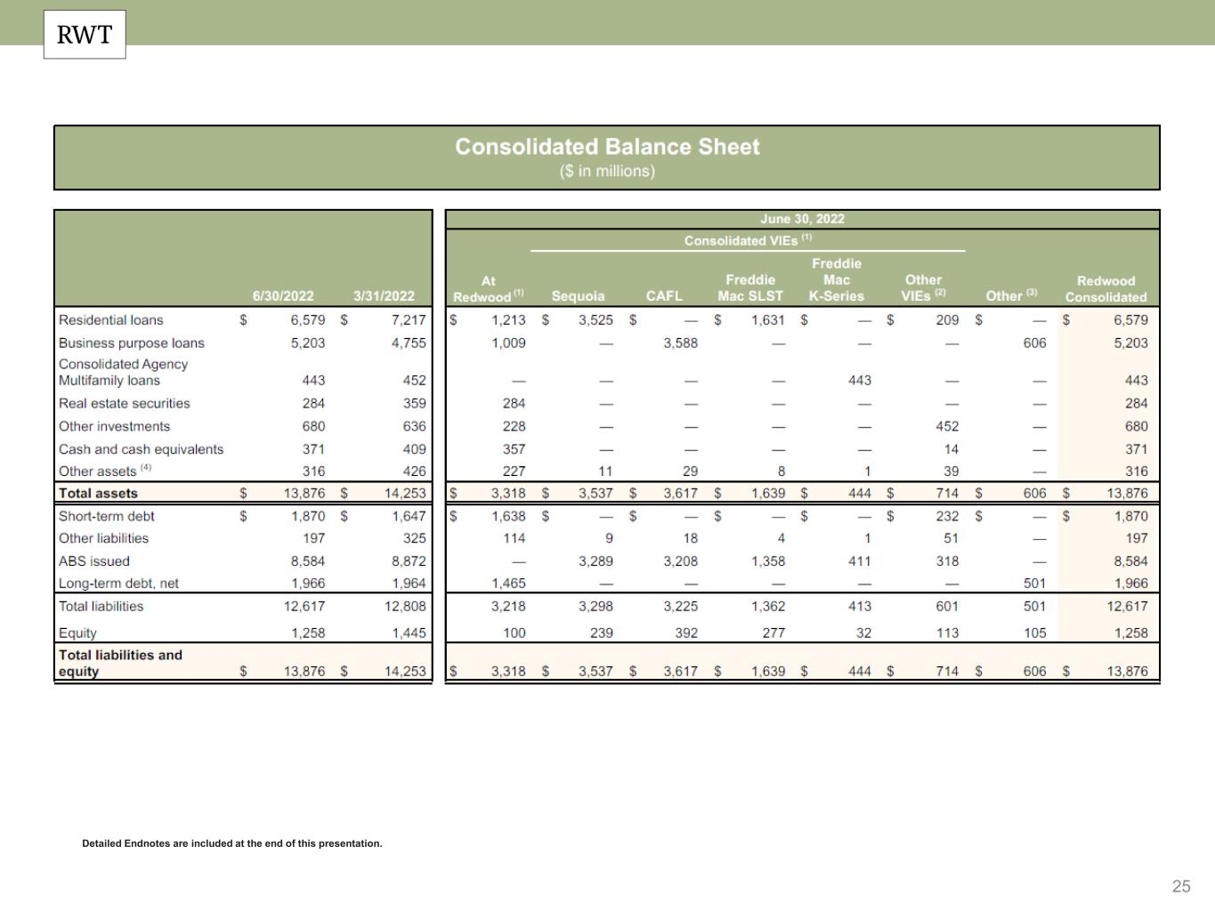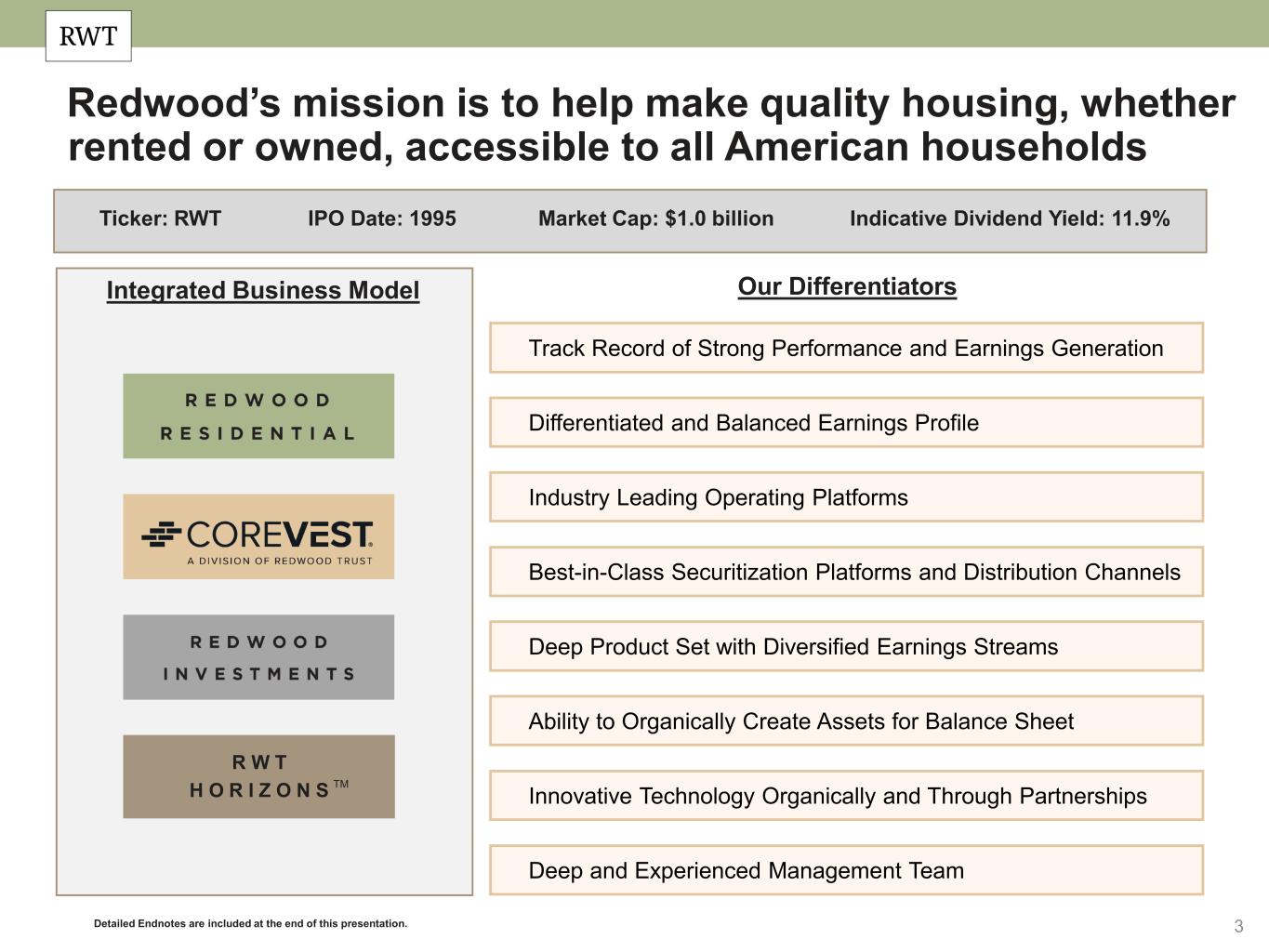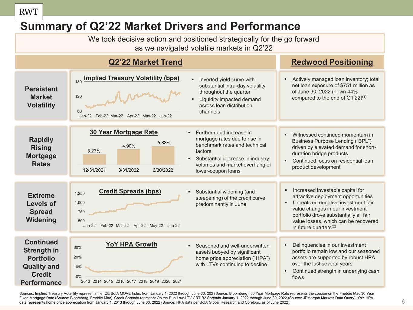 36 Slide 3 (Redwood’s Mission is to Help Make Quality Housing, Whether Rented or Owned, Accessible to all American Households) Source: Company financial data as of June 30, 2022 unless otherwise noted. Market data per Bloomberg as of June 30, 2022. Slide 4 (Redwood Operates Across Three Complementary Business Lines) Source: Company financial data as of June 30, 2022 unless otherwise noted. 1. Allocated capital includes working capital and platform premium for mortgage banking operations and all investments net of associated debt for investment portfolio. Note, capital allocation excludes corporate capital and RWT Horizons. Further detail on the components of allocated capital is included on slide 28 of this presentation. 2. Annualized Addressable Market Opportunity. Residential Mortgage Banking represents Q1’22 volumes of Jumbo and Expanded Credit origination annualized (Source: Inside Mortgage Finance as of May 19, 2022). Business Purpose Mortgage Banking based on combined opportunity for SFR and Multifamily Rental. SFR based on June 2022 data and potential financing opportunity for SFR of $140 billion over 3-4 years (Source: John Burns Real Estate Consulting, LLC and internal Company estimates). Multifamily based on Freddie Mac 2022 multifamily origination estimate of $450 billion and applying the estimated percentage from latest available FNMA data for origination by non-traditional multifamily lenders. Investment Portfolio represents 2022 estimated investment opportunities across PLS Subs, CRT, HEI, MF, Bridge and CAFL SFR investments (Source: internal Company estimates). Endnotes Slide 5 (Q2’22 Financial Performance) Source: Company financial data as of June 30, 2022 unless otherwise noted. Market data per Bloomberg as of June 30, 2022. 1. Total economic return is based on the periodic change in GAAP book value per common share plus dividends declared per common share during the period, divided by beginning period GAAP book value per common share. 2. Indicative dividend yield based on RWT closing stock price of $7.71 as of June 30, 2022. 3. Allocated capital includes working capital and platform premium for mortgage banking operations and all investments net of associated debt for investment portfolio. Capital allocation excludes corporate capital and RWT Horizons. Further detail on the components of allocated capital is included on slide 28 of this presentation. 4. Adjusted Return on Capital is a non-GAAP metric. Please refer to Non- GAAP Measures on slide 35 for more information. 5. Recourse leverage ratio is defined as recourse debt at Redwood exclusive of other liabilities, divided by tangible stockholders' equity. Recourse debt excludes $9.3 billion of consolidated securitization debt (ABS issued and servicer advance financing) and other debt that is non-recourse to Redwood, and tangible stockholders' equity excludes $35 million of intangible assets. Slide 6 (Summary of Q2’22 Market Drivers and Performance) 1. Total net loan exposure represents the sum of $1.0 billion of loans held on balance sheet and $0.3 billion of loans identified for purchase (locked loans not yet purchased), less $0.5 billion of loans subject to forward sale commitments, each at June 30, 2022. 2. Based on our current estimates, we expect low realized losses and ultimate recovery of asset resolutions will help Redwood realize positive fair value changes for its investment portfolio over time. There are several factors that may impact our ability to realize all, or a portion, of these positive fair value changes which many be out of our control, including credit performance and prepayment speeds. Actual fair value changes may differ materially.