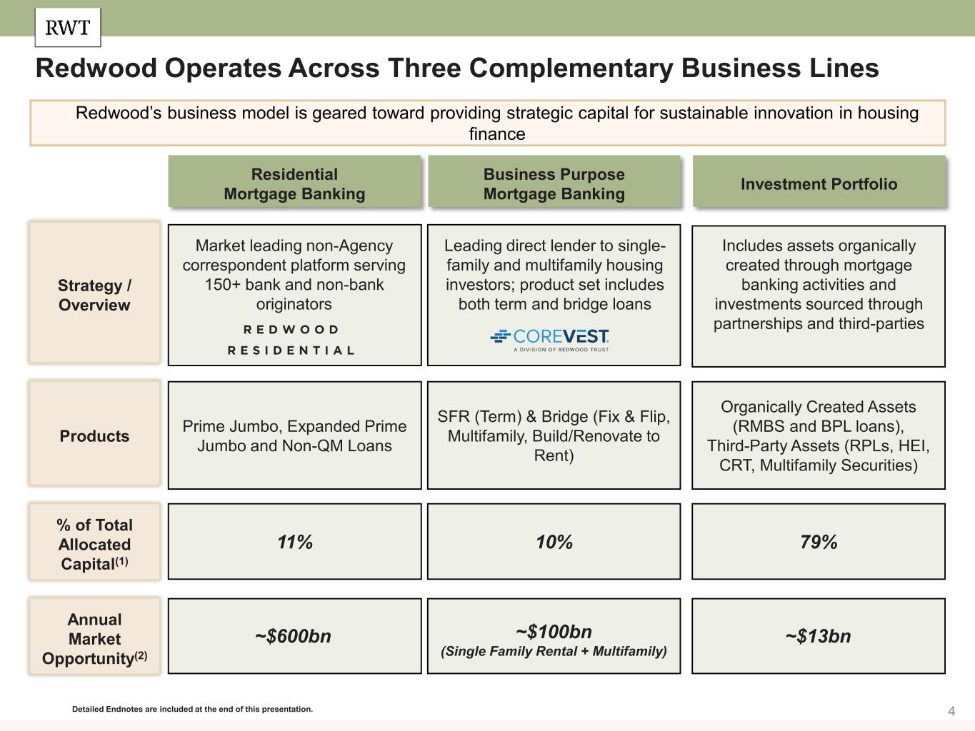3 Redwood’s mission is to help make quality housing, whether rented or owned, accessible to all American households R W T H O R I Z O N S Innovative Technology Organically and Through Partnerships Industry Leading Operating Platforms Ability to Organically Create Assets for Balance Sheet Best-in-Class Securitization Platforms and Distribution Channels Differentiated and Balanced Earnings Profile Integrated Business Model Our Differentiators Deep Product Set with Diversified Earnings Streams Track Record of Strong Performance and Earnings Generation Deep and Experienced Management Team Ticker: RWT IPO Date: 1995 Market Cap: $1.0 billion Indicative Dividend Yield: 11.9% Detailed Endnotes are included at the end of this presentation. TM