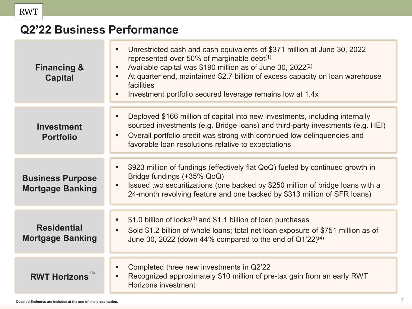 6 Witnessed continued momentum in Business Purpose Lending (“BPL”) driven by elevated demand for short- duration bridge products Continued focus on residential loan product development Increased investable capital for attractive deployment opportunities Unrealized negative investment fair value changes in our investment portfolio drove substantially all fair value losses, which can be recovered in future quarters(2) Delinquencies in our investment portfolio remain low and our seasoned assets are supported by robust HPA over the last several years Continued strength in underlying cash flows Summary of Q2’22 Market Drivers and Performance We took decisive action and positioned strategically for the go forward as we navigated volatile markets in Q2’22 Q2’22 Market Trend Extreme Levels of Spread Widening Continued Strength in Portfolio Quality and Credit Performance Credit Spreads (bps) YoY HPA Growth 0% 10% 20% 30% 2013 2014 2015 2016 2017 2018 2019 2020 2021 Persistent Market Volatility Rapidly Rising Mortgage Rates Implied Treasury Volatility (bps) 30 Year Mortgage Rate 500 750 1,000 1,250 Jan-22 Feb-22 Mar-22 Apr-22 May-22 Jun-22 Actively managed loan inventory; total net loan exposure of $751 million as of June 30, 2022 (down 44% compared to the end of Q1’22)(1) Redwood Positioning Sources: Implied Treasury Volatility represents the ICE BofA MOVE Index from January 1, 2022 through June 30, 202 (Source: Bloomberg). 30 Year Mortgage Rate represents the coupon on the Freddie Mac 30 Year Fixed Mortgage Rate (Source: Bloomberg, Freddie Mac). Credit Spreads represent On the Run Low-LTV CRT B2 Spreads January 1, 2022 through June 30, 2022 (Source: JPMorgan Markets Data Query). YoY HPA data represents home price appreciation from January 1, 2013 through June 30, 2022 (Source: HPA data per BofA Global Research and Corelogic as of June 2022). 60 120 180 Jan-22 Feb-22 Mar-22 Apr-22 May-22 Jun-22 3.27% 4.90% 5.83% 12/31/2021 3/31/2022 6/30/2022 Inverted yield curve with substantial intra-day volatility throughout the quarter Liquidity impacted demand across loan distribution channels Further rapid increase in mortgage rates due to rise in benchmark rates and technical factors Substantial decrease in industry volumes and market overhang of lower-coupon loans Substantial widening (and steepening) of the credit curve predominantly in June Seasoned and well-underwritten assets buoyed by significant home price appreciation (“HPA”) with LTVs continuing to decline