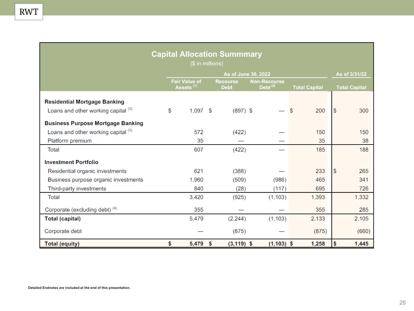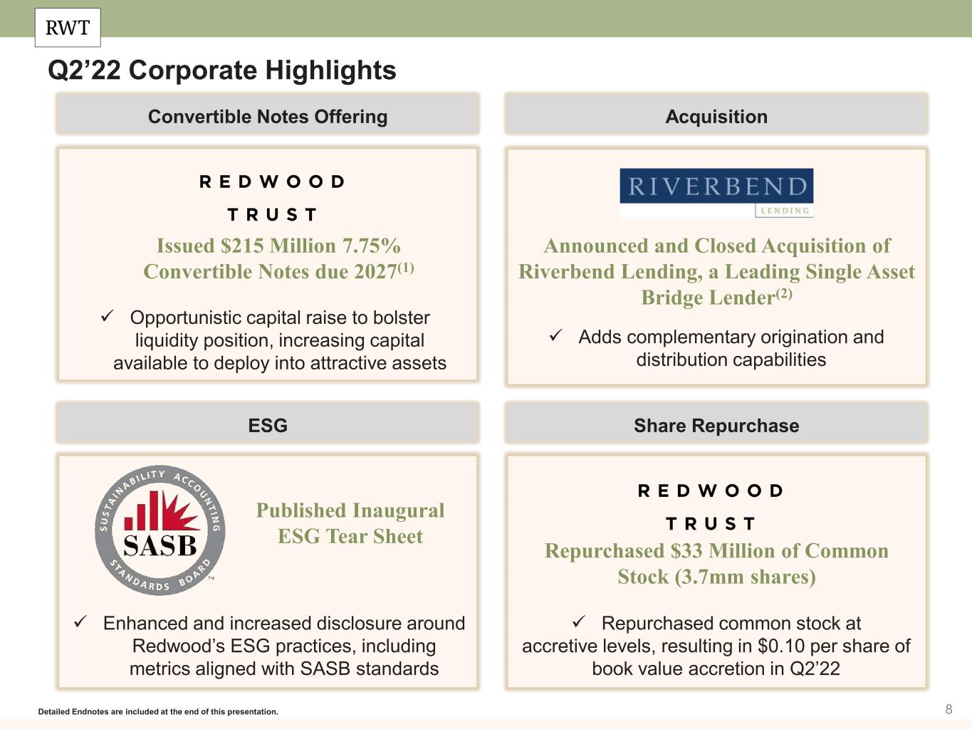 7 Q2’22 Business Performance Detailed Endnotes are included at the end of this presentation. $1.0 billion of locks(3) and $1.1 billion of loan purchases Sold $1.2 billion of whole loans; total net loan exposure of $751 million as of June 30, 2022 (down 44% compared to the end of Q1’22)(4) Residential Mortgage Banking Completed three new investments in Q2’22 Recognized approximately $10 million of pre-tax gain from an early RWT Horizons investment RWT Horizons $923 million of fundings (effectively flat QoQ) fueled by continued growth in Bridge fundings (+35% QoQ) Issued two securitizations (one backed by $250 million of bridge loans with a 24-month revolving feature and one backed by $313 million of SFR loans) Business Purpose Mortgage Banking TM Deployed $166 million of capital into new investments, including internally sourced investments (e.g. Bridge loans) and third-party investments (e.g. HEI) Overall portfolio credit was strong with continued low delinquencies and favorable loan resolutions relative to expectations Investment Portfolio Unrestricted cash and cash equivalents of $371 million at June 30, 2022 represented over 50% of marginable debt(1) Available capital was $190 million as of June 30, 2022(2) At quarter end, maintained $2.7 billion of excess capacity on loan warehouse facilities Investment portfolio secured leverage remains low at 1.4x Financing & Capital