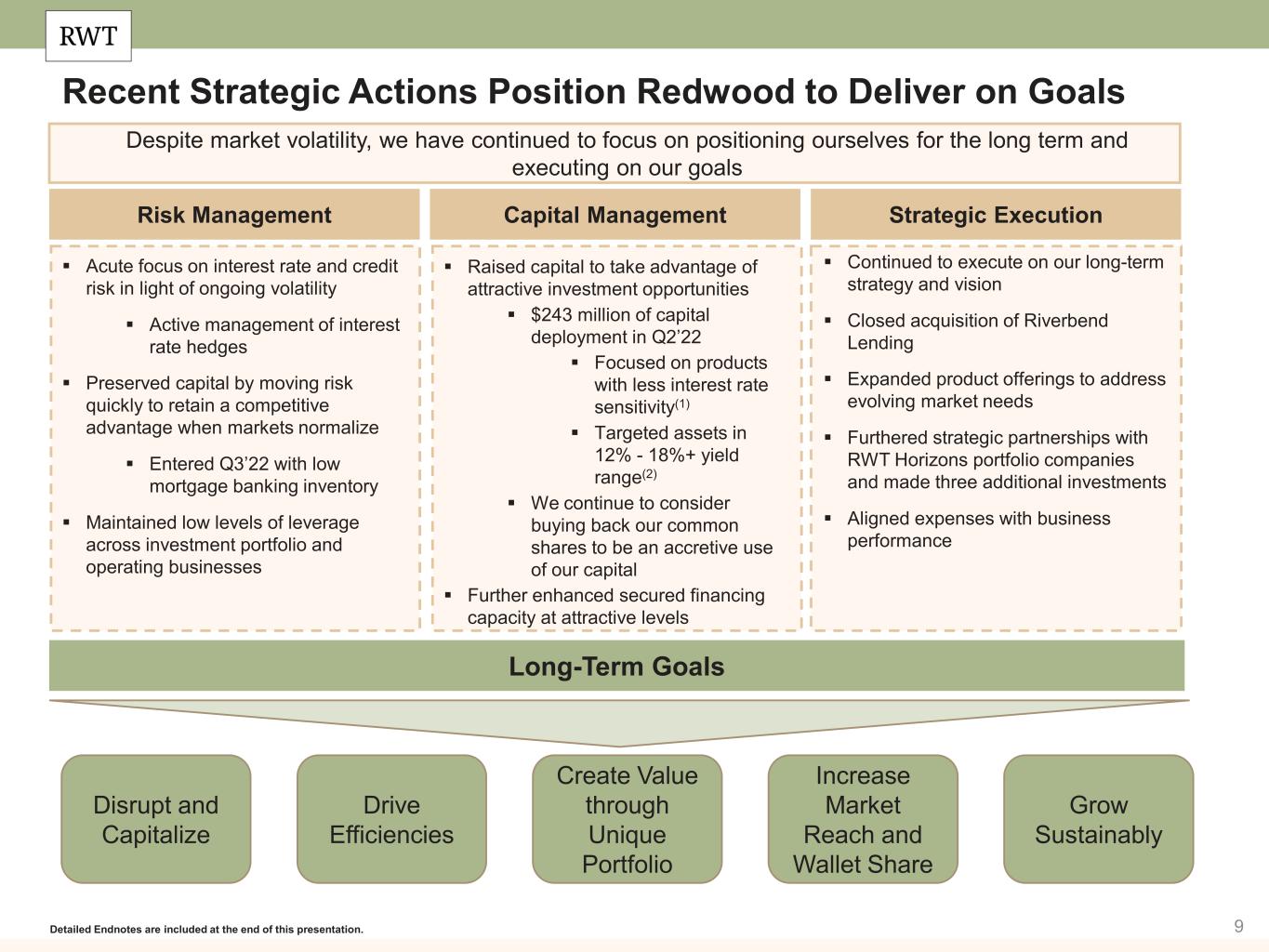 8 Q2’22 Corporate Highlights Detailed Endnotes are included at the end of this presentation. Convertible Notes Offering Acquisition ESG Share Repurchase Published Inaugural ESG Tear Sheet Announced and Closed Acquisition of Riverbend Lending, a Leading Single Asset Bridge Lender(2) Issued $215 Million 7.75% Convertible Notes due 2027(1) Repurchased $33 Million of Common Stock (3.7mm shares) Opportunistic capital raise to bolster liquidity position, increasing capital available to deploy into attractive assets Adds complementary origination and distribution capabilities Repurchased common stock at accretive levels, resulting in $0.10 per share of book value accretion in Q2’22 Enhanced and increased disclosure around Redwood’s ESG practices, including metrics aligned with SASB standards