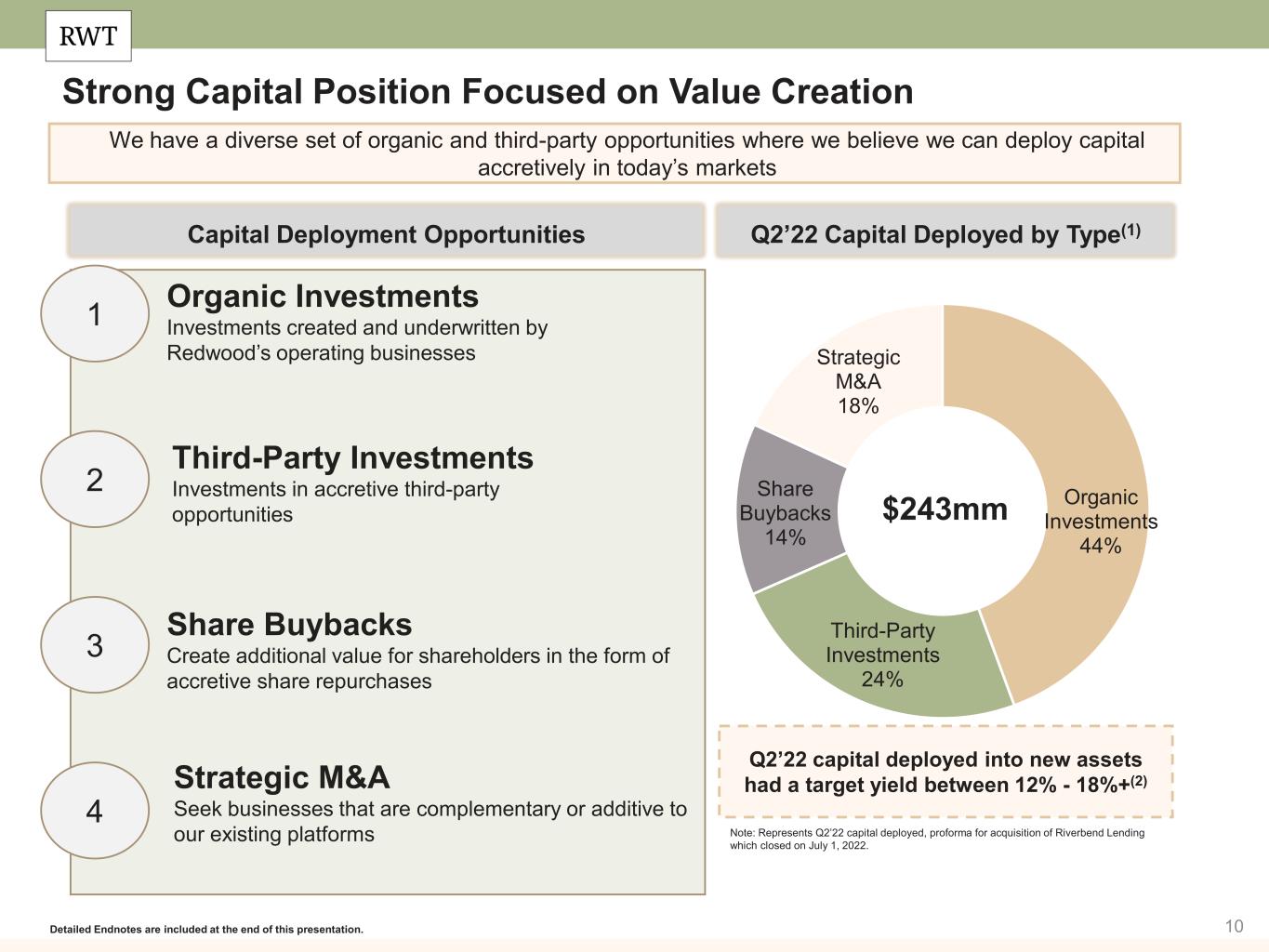 9 Recent Strategic Actions Position Redwood to Deliver on Goals Detailed Endnotes are included at the end of this presentation. Despite market volatility, we have continued to focus on positioning ourselves for the long term and executing on our goals Risk Management Capital Management Strategic Execution Disrupt and Capitalize Drive Efficiencies Increase Market Reach and Wallet Share Grow Sustainably Create Value through Unique Portfolio Long-Term Goals Raised capital to take advantage of attractive investment opportunities $243 million of capital deployment in Q2’22 Focused on products with less interest rate sensitivity(1) Targeted assets in 12% - 18%+ yield range(2) We continue to consider buying back our common shares to be an accretive use of our capital Further enhanced secured financing capacity at attractive levels Continued to execute on our long-term strategy and vision Closed acquisition of Riverbend Lending Expanded product offerings to address evolving market needs Furthered strategic partnerships with RWT Horizons portfolio companies and made three additional investments Aligned expenses with business performance Acute focus on interest rate and credit risk in light of ongoing volatility Active management of interest rate hedges Preserved capital by moving risk quickly to retain a competitive advantage when markets normalize Entered Q3’22 with low mortgage banking inventory Maintained low levels of leverage across investment portfolio and operating businesses