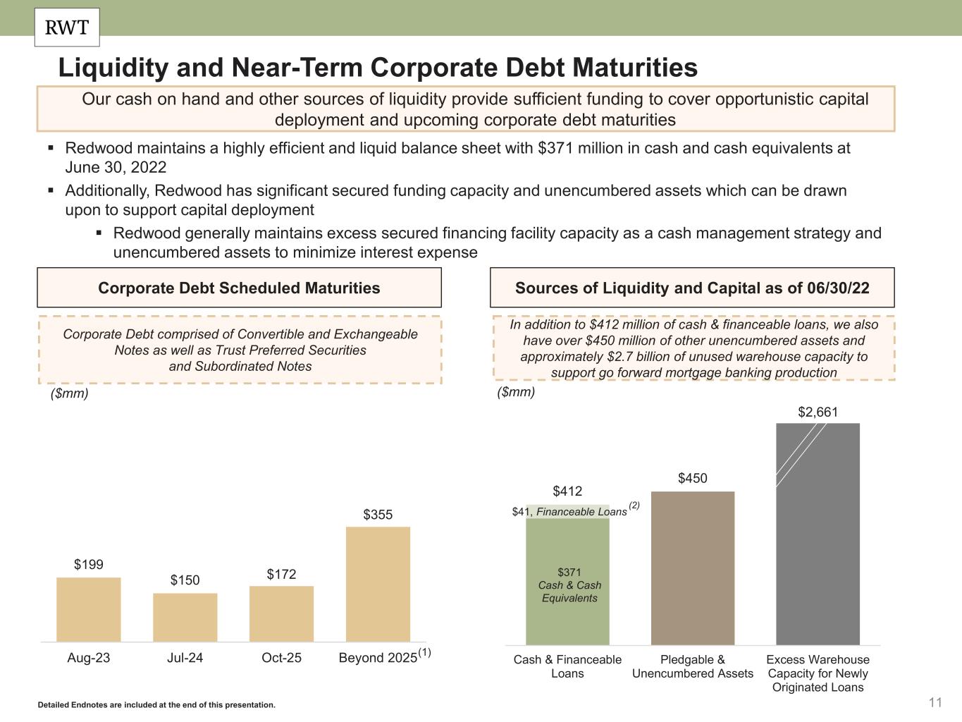 10 Strong Capital Position Focused on Value Creation Detailed Endnotes are included at the end of this presentation. We have a diverse set of organic and third-party opportunities where we believe we can deploy capital accretively in today’s markets 1 2 3 4 Capital Deployment Opportunities Organic Investments Investments created and underwritten by Redwood’s operating businesses Third-Party Investments Investments in accretive third-party opportunities Share Buybacks Create additional value for shareholders in the form of accretive share repurchases Strategic M&A Seek businesses that are complementary or additive to our existing platforms Q2’22 Capital Deployed by Type(1) Note: Represents Q2’22 capital deployed, proforma for acquisition of Riverbend Lending which closed on July 1, 2022. Organic Investments 44% Third-Party Investments 24% Share Buybacks 14% Strategic M&A 18% $243mm Q2’22 capital deployed into new assets had a target yield between 12% - 18%+(2)