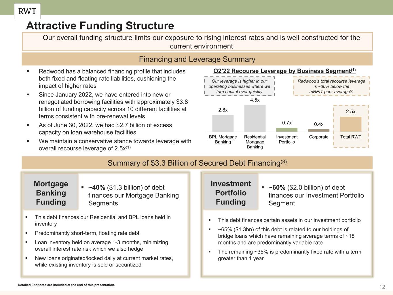 11 $412 $450 Cash & Financeable Loans Pledgable & Unencumbered Assets Excess Warehouse Capacity for Newly Originated Loans Liquidity and Near-Term Corporate Debt Maturities $199 $150 $172 $355 Aug-23 Jul-24 Oct-25 Beyond 2025 ($mm) Corporate Debt Scheduled Maturities Sources of Liquidity and Capital as of 06/30/22 Corporate Debt comprised of Convertible and Exchangeable Notes as well as Trust Preferred Securities and Subordinated Notes Redwood maintains a highly efficient and liquid balance sheet with $371 million in cash and cash equivalents at June 30, 2022 Additionally, Redwood has significant secured funding capacity and unencumbered assets which can be drawn upon to support capital deployment Redwood generally maintains excess secured financing facility capacity as a cash management strategy and unencumbered assets to minimize interest expense Our cash on hand and other sources of liquidity provide sufficient funding to cover opportunistic capital deployment and upcoming corporate debt maturities Detailed Endnotes are included at the end of this presentation. In addition to $412 million of cash & financeable loans, we also have over $450 million of other unencumbered assets and approximately $2.7 billion of unused warehouse capacity to support go forward mortgage banking production (1) $2,661 $371 Cash & Cash Equivalents $41, Financeable Loans ($mm) (2)