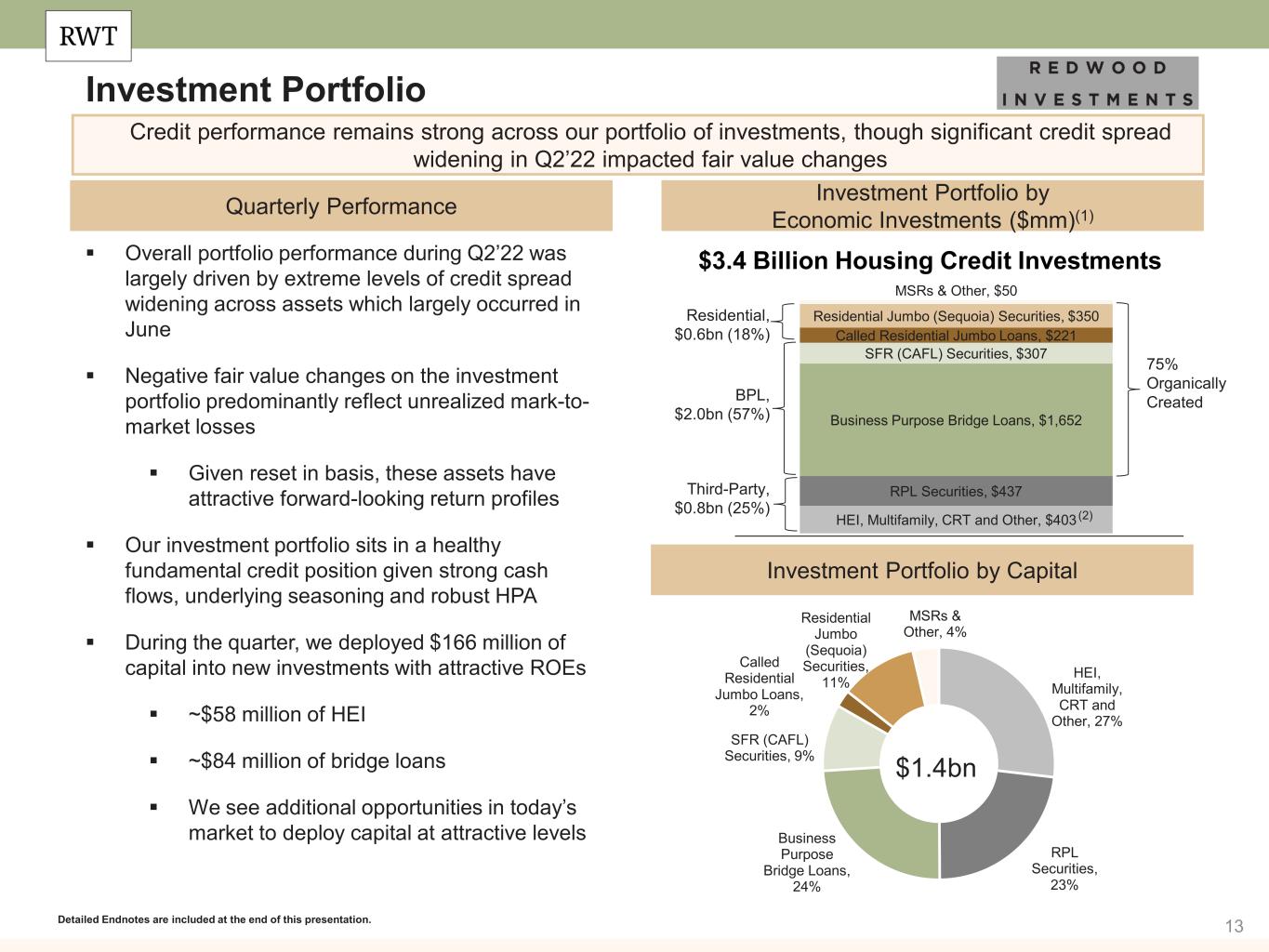 12 Attractive Funding Structure Our overall funding structure limits our exposure to rising interest rates and is well constructed for the current environment Financing and Leverage Summary Redwood has a balanced financing profile that includes both fixed and floating rate liabilities, cushioning the impact of higher rates Since January 2022, we have entered into new or renegotiated borrowing facilities with approximately $3.8 billion of funding capacity across 10 different facilities at terms consistent with pre-renewal levels As of June 30, 2022, we had $2.7 billion of excess capacity on loan warehouse facilities We maintain a conservative stance towards leverage with overall recourse leverage of 2.5x(1) Summary of $3.3 Billion of Secured Debt Financing(3) This debt finances our Residential and BPL loans held in inventory Predominantly short-term, floating rate debt Loan inventory held on average 1-3 months, minimizing overall interest rate risk which we also hedge New loans originated/locked daily at current market rates, while existing inventory is sold or securitized Mortgage Banking Funding ~40% ($1.3 billion) of debt finances our Mortgage Banking Segments This debt finances certain assets in our investment portfolio ~65% ($1.3bn) of this debt is related to our holdings of bridge loans which have remaining average terms of ~18 months and are predominantly variable rate The remaining ~35% is predominantly fixed rate with a term greater than 1 year Investment Portfolio Funding ~60% ($2.0 billion) of debt finances our Investment Portfolio Segment Detailed Endnotes are included at the end of this presentation. Q2’22 Recourse Leverage by Business Segment(1) 2.8x 4.5x 0.7x 0.4x 2.5x BPL Mortgage Banking Residential Mortgage Banking Investment Portfolio Corporate Total RWT Our leverage is higher in our operating businesses where we turn capital over quickly Redwood’s total recourse leverage is ~30% below the mREIT peer average(2)
