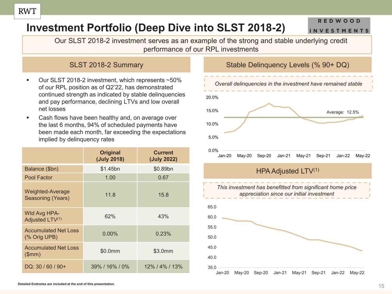 14 Investment Portfolio (Continued) Detailed Endnotes are included at the end of this presentation. Credit performance in our underlying portfolio remains stable and supported by significant levels of HPA, seasoning and other favorable credit characteristics During the second quarter, our investment portfolio continued to demonstrate strong performance across a range of credit metrics and we are not seeing notable deterioration in housing credit through Q2’22 We primarily target investments that have a sensitivity to housing credit risk, typically sourced through our operating businesses where we control the underwriting and review of underlying collateral Given the seasoned nature of our investments (particularly our SLST and SEMT securities), many of these investments are supported by substantial home price appreciation and borrower equity in the underlying homes Overall portfolio delinquencies have remained low and we have seen continued favorable loan resolutions Improving LTVs backed by increases in HPA support low overall losses Underlying Loan Seasoning (Years) Low Delinquencies (% 90+ DQ) 12.1 10.2 10.2 10.9 13.3 2.0 2.1 1.5 1.5 1.71.7 1.7 1.9 2.1 2.4 4.9 3.7 1.9 4.2 2.6 Q2'21 Q3'21 Q4'21 Q1'22 Q2'22 SLST (RPL) SEMT (Jumbo) CAFL (SFR) BridgeSeasoned assets that have lower sensitivity to changes in interest rates Delinquencies have remained low 15.6 4.2 2.6 1.0 SLST (RPL) SEMT (Jumbo) CAFL (SFR) Bridge Declining LTVs (HPA Adjusted LTVs(1)) 50.5 49.7 48.1 46.6 44.2 53.7 53.3 48.6 47.9 46.4 Q2'21 Q3'21 Q4'21 Q1'22 Q2'22 SLST (RPL) SEMT (Jumbo) Assets are supported by elevated levels of HPA that are well in excess of modeled expectations