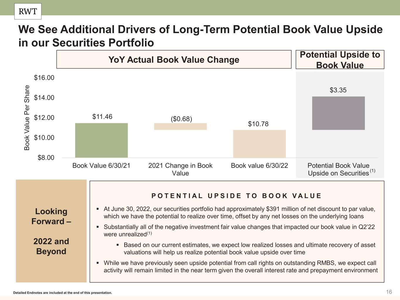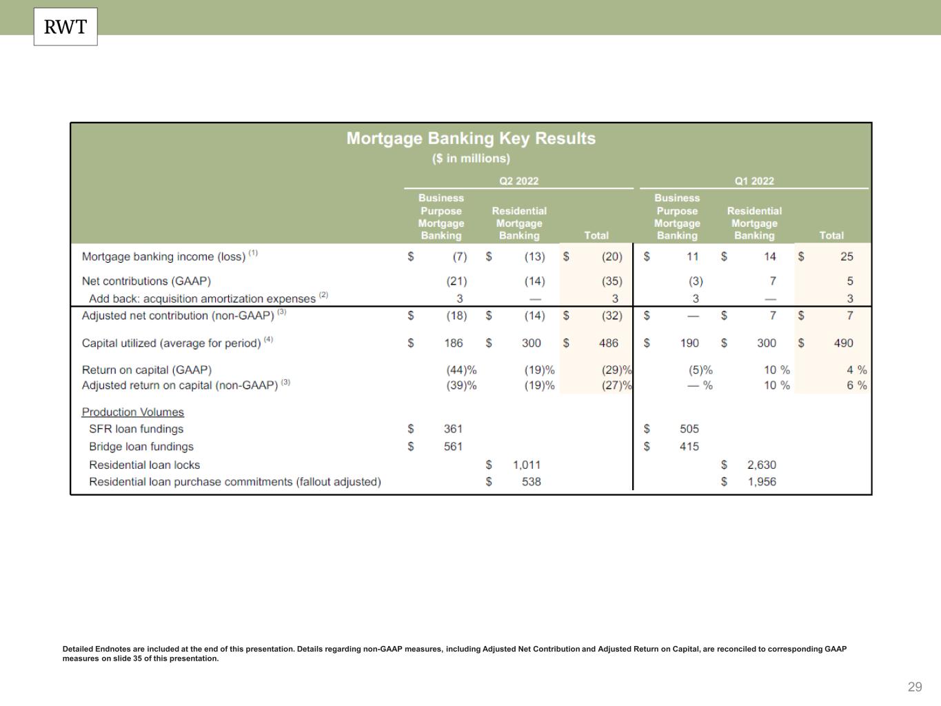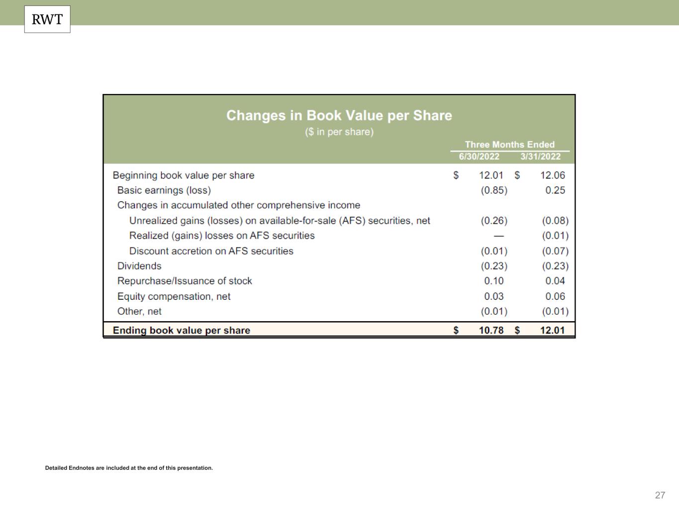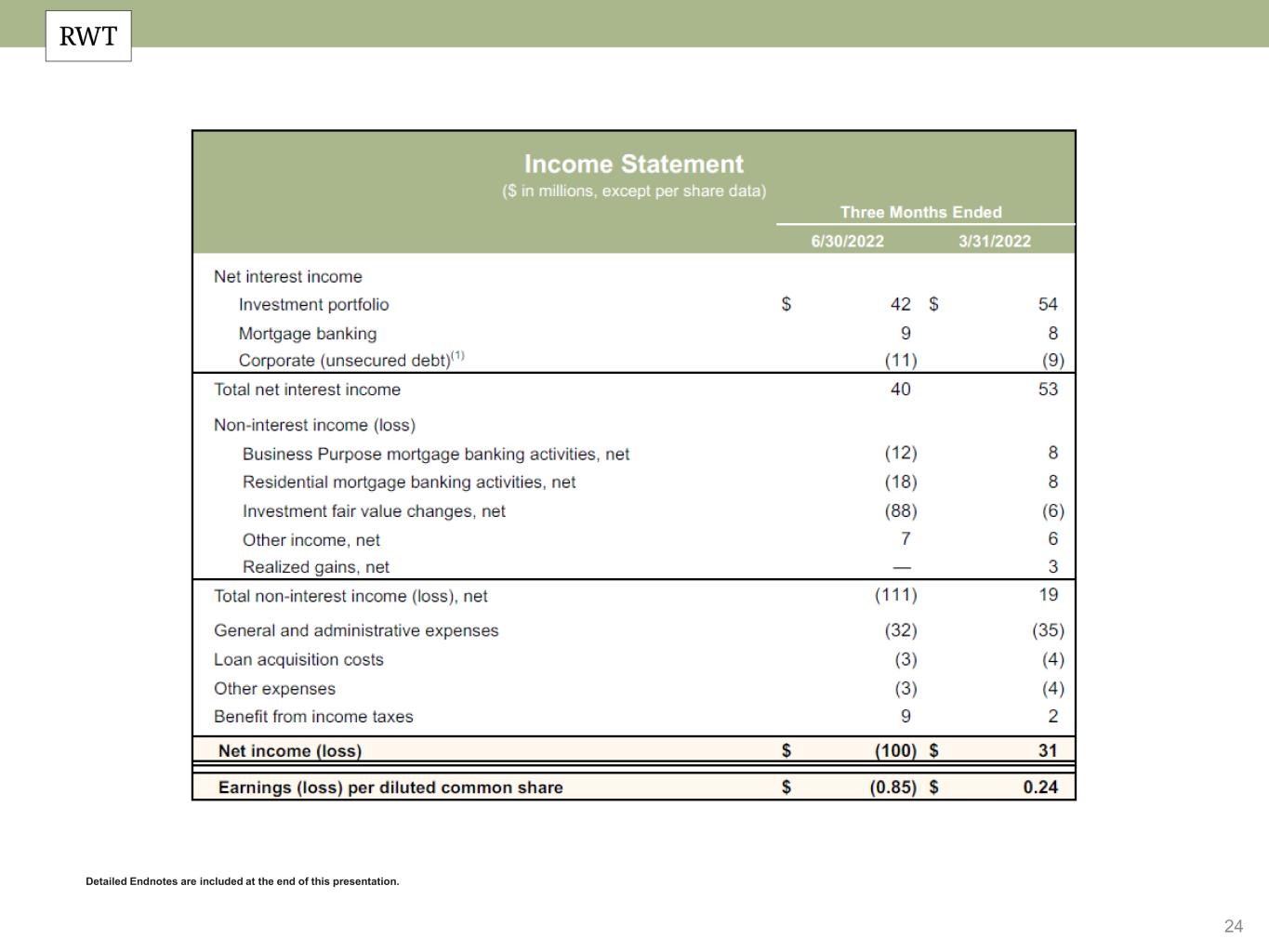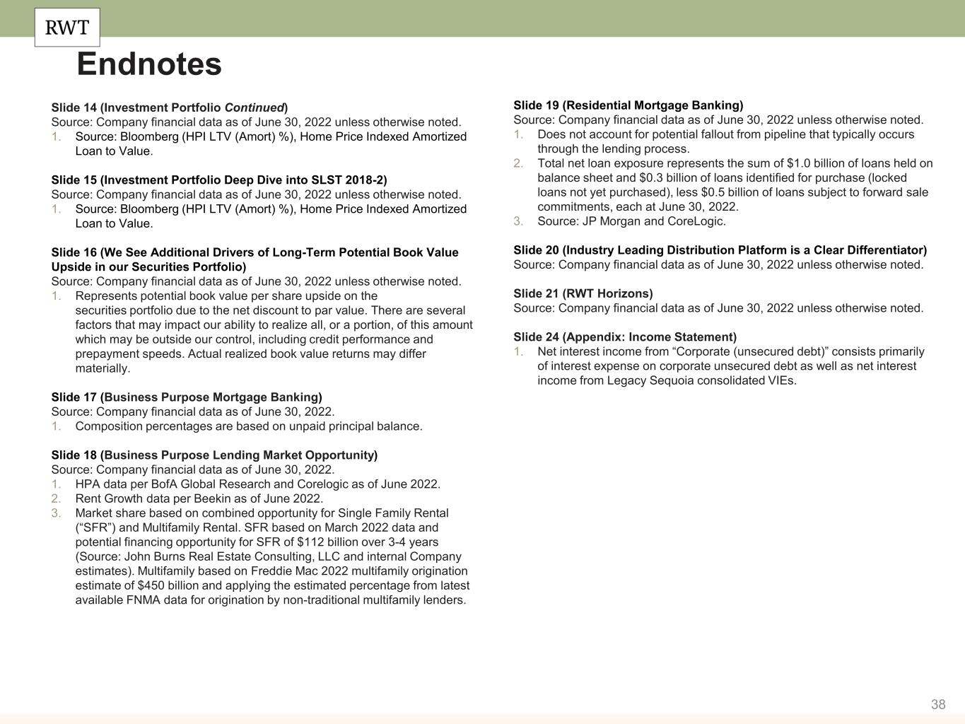 38 Slide 14 (Investment Portfolio Continued) Source: Company financial data as of June 30, 2022 unless otherwise noted. 1. Source: Bloomberg (HPI LTV (Amort) %), Home Price Indexed Amortized Loan to Value. Slide 15 (Investment Portfolio Deep Dive into SLST 2018-2) Source: Company financial data as of June 30, 2022 unless otherwise noted. 1. Source: Bloomberg (HPI LTV (Amort) %), Home Price Indexed Amortized Loan to Value. Slide 16 (We See Additional Drivers of Long-Term Potential Book Value Upside in our Securities Portfolio) Source: Company financial data as of June 30, 2022 unless otherwise noted. 1. Represents potential book value per share upside on the securities portfolio due to the net discount to par value. There are several factors that may impact our ability to realize all, or a portion, of this amount which may be outside our control, including credit performance and prepayment speeds. Actual realized book value returns may differ materially. Slide 17 (Business Purpose Mortgage Banking) Source: Company financial data as of June 30, 2022. 1. Composition percentages are based on unpaid principal balance. Slide 18 (Business Purpose Lending Market Opportunity) Source: Company financial data as of June 30, 2022. 1. HPA data per BofA Global Research and Corelogic as of June 2022. 2. Rent Growth data per Beekin as of June 2022. 3. Market share based on combined opportunity for Single Family Rental (“SFR”) and Multifamily Rental. SFR based on March 2022 data and potential financing opportunity for SFR of $112 billion over 3-4 years (Source: John Burns Real Estate Consulting, LLC and internal Company estimates). Multifamily based on Freddie Mac 2022 multifamily origination estimate of $450 billion and applying the estimated percentage from latest available FNMA data for origination by non-traditional multifamily lenders. Endnotes Slide 19 (Residential Mortgage Banking) Source: Company financial data as of June 30, 2022 unless otherwise noted. 1. Does not account for potential fallout from pipeline that typically occurs through the lending process. 2. Total net loan exposure represents the sum of $1.0 billion of loans held on balance sheet and $0.3 billion of loans identified for purchase (locked loans not yet purchased), less $0.5 billion of loans subject to forward sale commitments, each at June 30, 2022. 3. Source: JP Morgan and CoreLogic. Slide 20 (Industry Leading Distribution Platform is a Clear Differentiator) Source: Company financial data as of June 30, 2022 unless otherwise noted. Slide 21 (RWT Horizons) Source: Company financial data as of June 30, 2022 unless otherwise noted. Slide 24 (Appendix: Income Statement) 1. Net interest income from “Corporate (unsecured debt)” consists primarily of interest expense on corporate unsecured debt as well as net interest income from Legacy Sequoia consolidated VIEs.