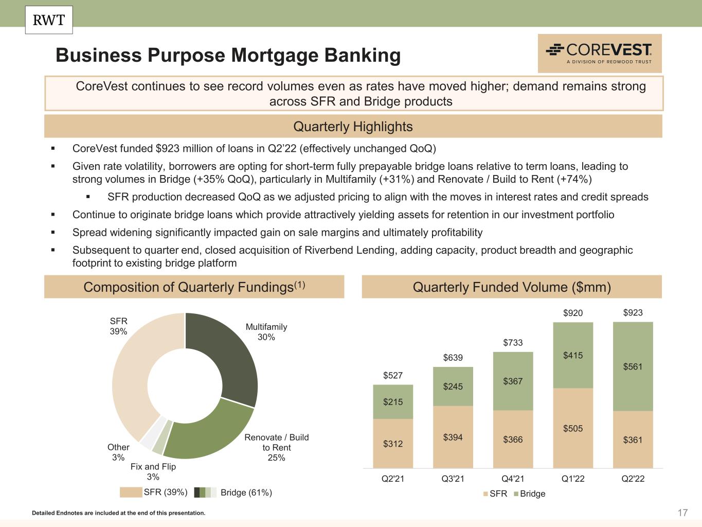 17 $312 $394 $366 $505 $361 $215 $245 $367 $415 $561 $527 $639 $733 $920 $923 Q2'21 Q3'21 Q4'21 Q1'22 Q2'22 SFR Bridge Business Purpose Mortgage Banking Quarterly Highlights Composition of Quarterly Fundings(1) Detailed Endnotes are included at the end of this presentation. CoreVest continues to see record volumes even as rates have moved higher; demand remains strong across SFR and Bridge products Quarterly Funded Volume ($mm) SFR (39%) Bridge (61%) Multifamily 30% Renovate / Build to Rent 25% Fix and Flip 3% Other 3% SFR 39% CoreVest funded $923 million of loans in Q2’22 (effectively unchanged QoQ) Given rate volatility, borrowers are opting for short-term fully prepayable bridge loans relative to term loans, leading to strong volumes in Bridge (+35% QoQ), particularly in Multifamily (+31%) and Renovate / Build to Rent (+74%) SFR production decreased QoQ as we adjusted pricing to align with the moves in interest rates and credit spreads Continue to originate bridge loans which provide attractively yielding assets for retention in our investment portfolio Spread widening significantly impacted gain on sale margins and ultimately profitability Subsequent to quarter end, closed acquisition of Riverbend Lending, adding capacity, product breadth and geographic footprint to existing bridge platform