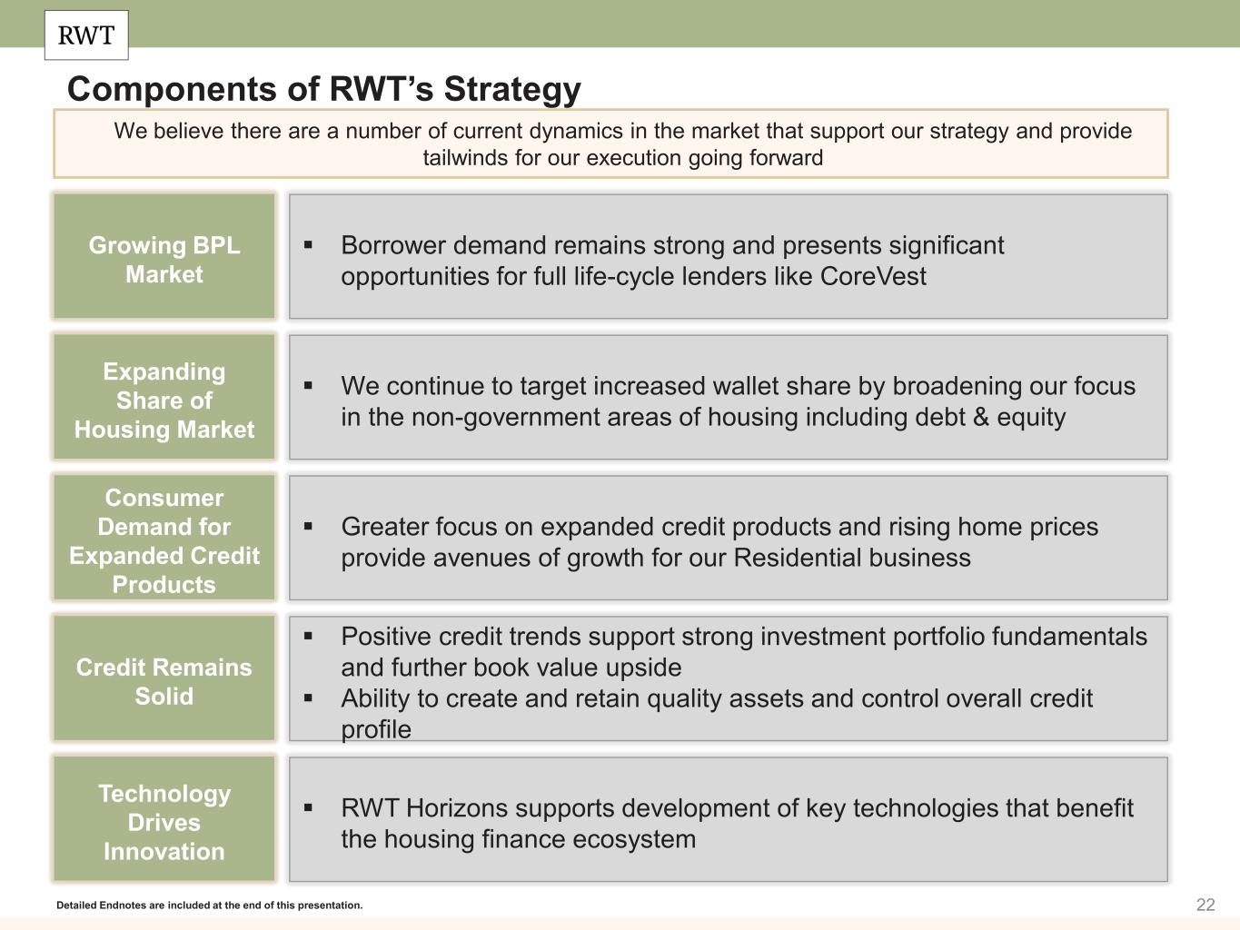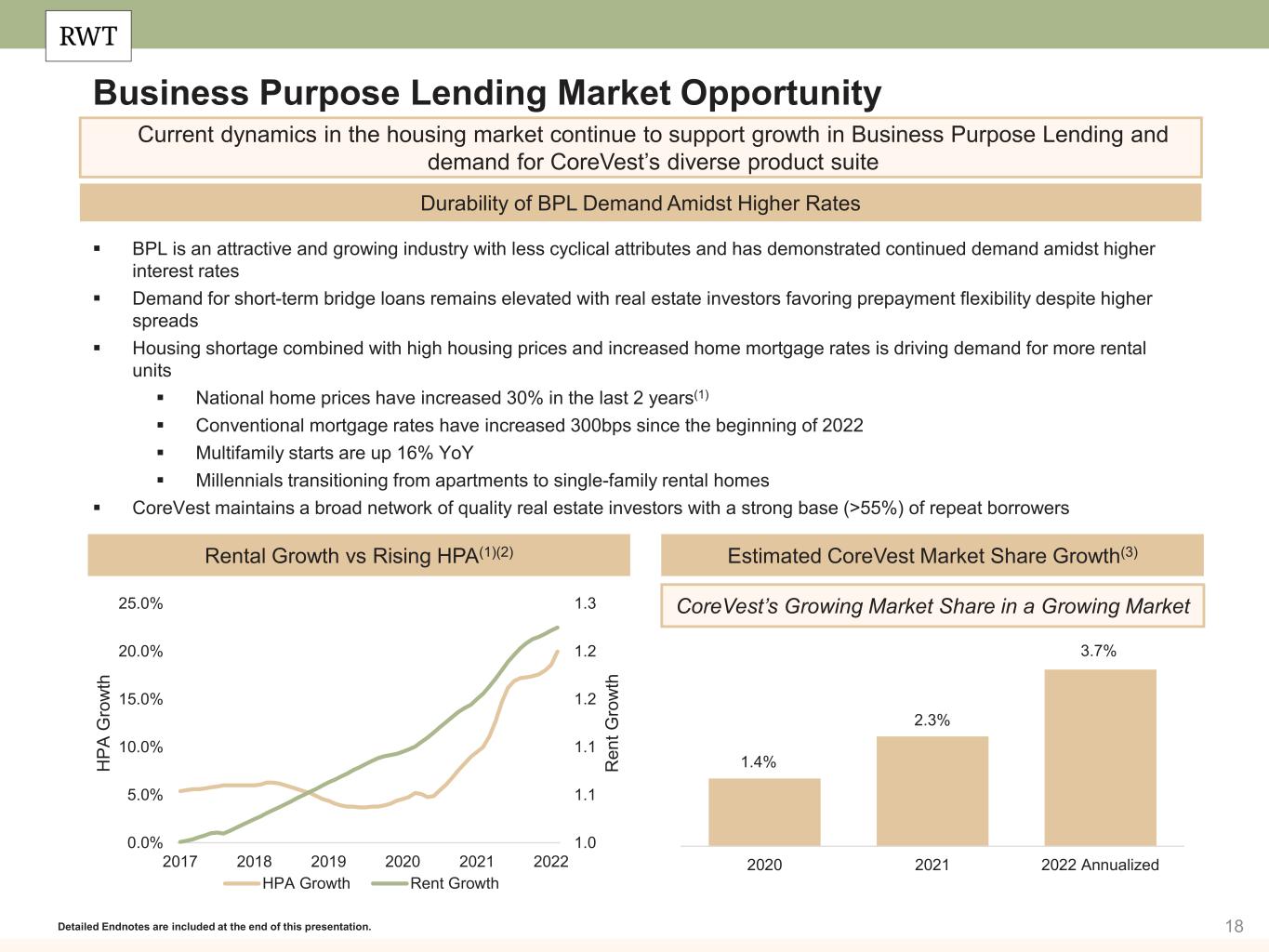 22 Components of RWT’s Strategy Expanding Share of Housing Market Consumer Demand for Expanded Credit Products Technology Drives Innovation Credit Remains Solid We continue to target increased wallet share by broadening our focus in the non-government areas of housing including debt & equity Greater focus on expanded credit products and rising home prices provide avenues of growth for our Residential business Positive credit trends support strong investment portfolio fundamentals and further book value upside Ability to create and retain quality assets and control overall credit profile RWT Horizons supports development of key technologies that benefit the housing finance ecosystem Detailed Endnotes are included at the end of this presentation. Growing BPL Market Borrower demand remains strong and presents significant opportunities for full life-cycle lenders like CoreVest We believe there are a number of current dynamics in the market that support our strategy and provide tailwinds for our execution going forward