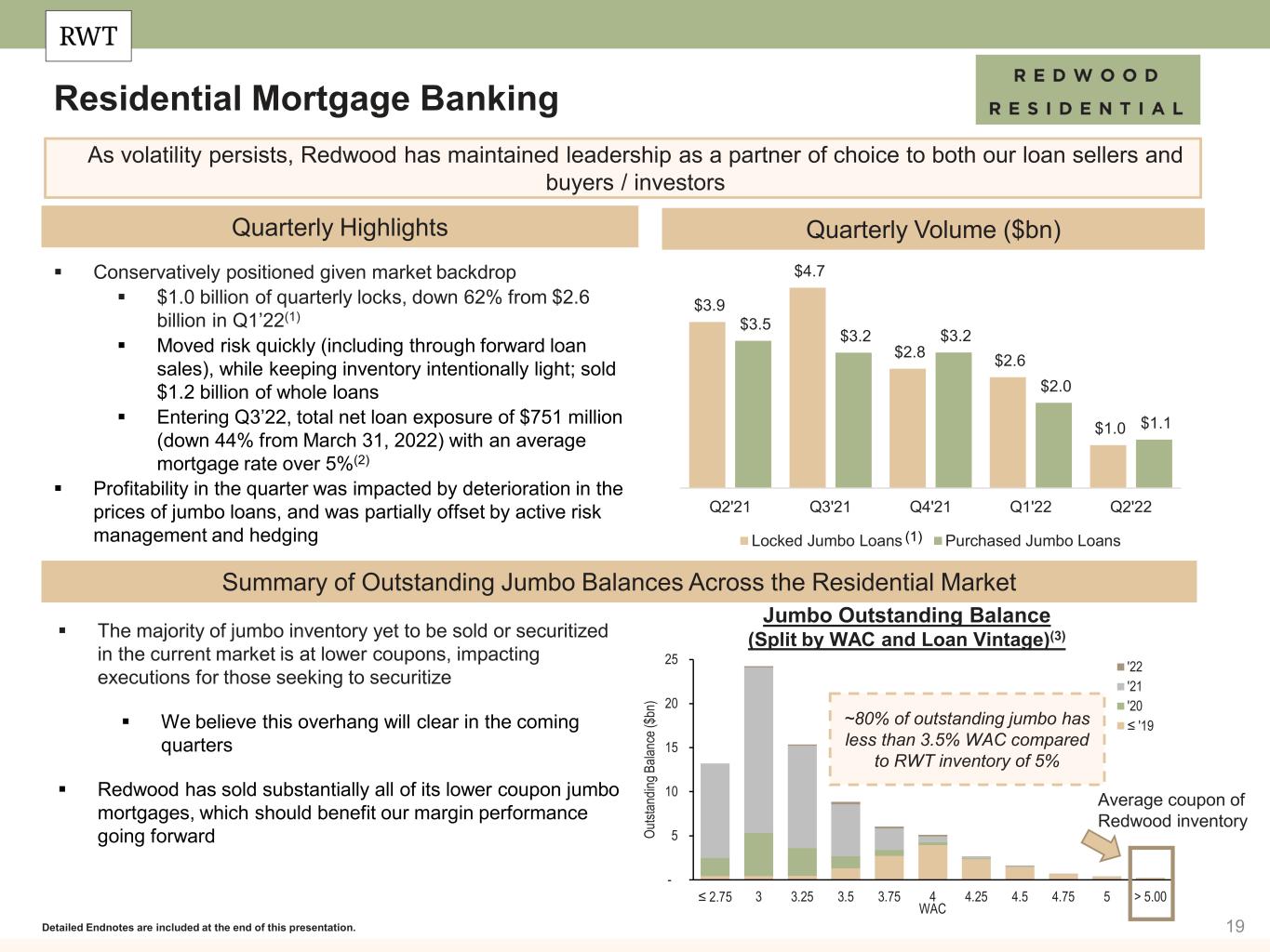 19 - 5 10 15 20 25 ≤ 2.75 3 3.25 3.5 3.75 4 4.25 4.5 4.75 5 > 5.00 Ou tst an din g B ala nc e ( $b n) WAC '22 '21 '20 ≤ '19 Conservatively positioned given market backdrop $1.0 billion of quarterly locks, down 62% from $2.6 billion in Q1’22(1) Moved risk quickly (including through forward loan sales), while keeping inventory intentionally light; sold $1.2 billion of whole loans Entering Q3’22, total net loan exposure of $751 million (down 44% from March 31, 2022) with an average mortgage rate over 5%(2) Profitability in the quarter was impacted by deterioration in the prices of jumbo loans, and was partially offset by active risk management and hedging Residential Mortgage Banking Quarterly Volume ($bn) Summary of Outstanding Jumbo Balances Across the Residential Market Quarterly Highlights Detailed Endnotes are included at the end of this presentation. As volatility persists, Redwood has maintained leadership as a partner of choice to both our loan sellers and buyers / investors (1) $3.9 $4.7 $2.8 $2.6 $1.0 $3.5 $3.2 $3.2 $2.0 $1.1 Q2'21 Q3'21 Q4'21 Q1'22 Q2'22 Locked Jumbo Loans Purchased Jumbo Loans The majority of jumbo inventory yet to be sold or securitized in the current market is at lower coupons, impacting executions for those seeking to securitize We believe this overhang will clear in the coming quarters Redwood has sold substantially all of its lower coupon jumbo mortgages, which should benefit our margin performance going forward ~80% of outstanding jumbo has less than 3.5% WAC compared to RWT inventory of 5% Jumbo Outstanding Balance (Split by WAC and Loan Vintage)(3) Average coupon of Redwood inventory