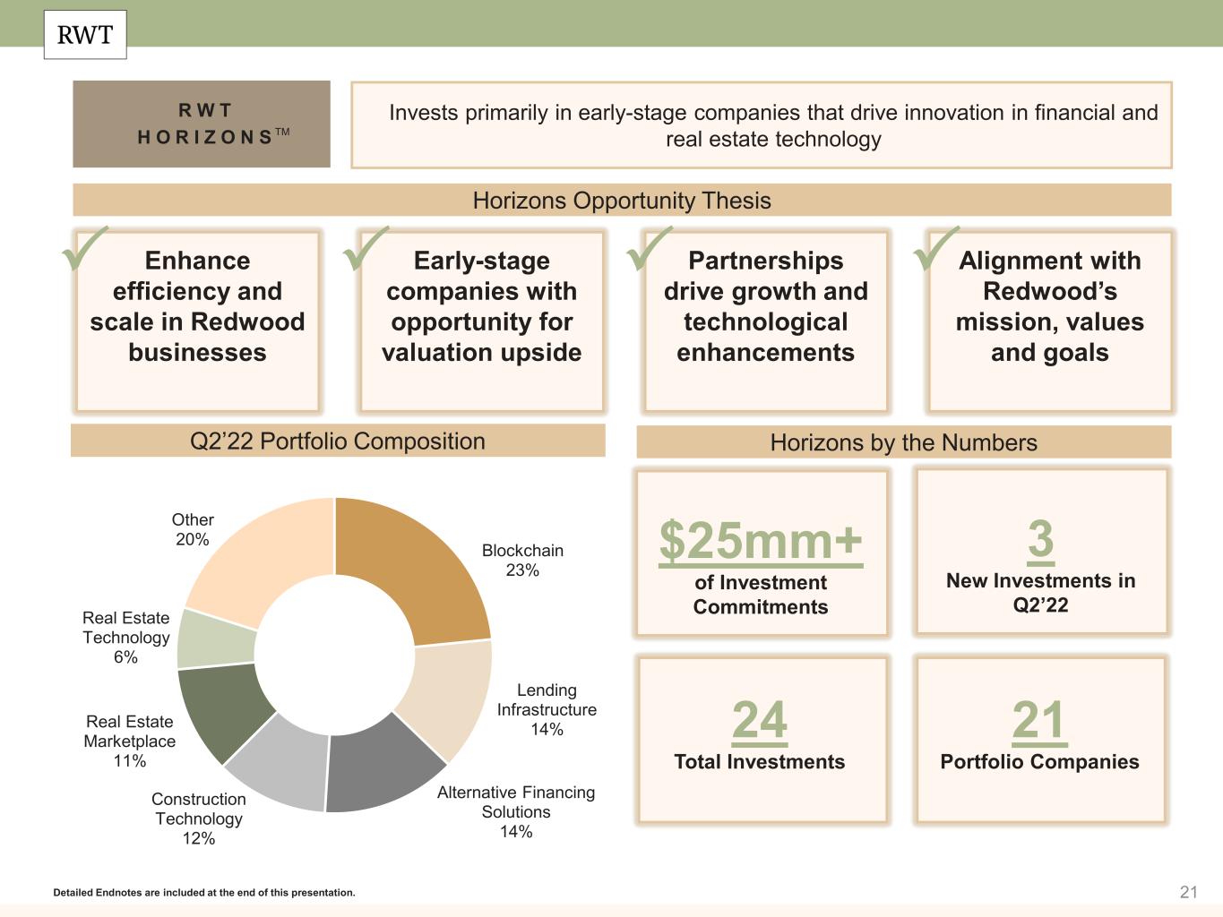 21 R W T H O R I Z O N S Horizons by the Numbers Detailed Endnotes are included at the end of this presentation. Invests primarily in early-stage companies that drive innovation in financial and real estate technologyTM Horizons Opportunity Thesis Enhance efficiency and scale in Redwood businesses Early-stage companies with opportunity for valuation upside Partnerships drive growth and technological enhancements Alignment with Redwood’s mission, values and goals $25mm+ of Investment Commitments 24 Total Investments 21 Portfolio Companies Q2’22 Portfolio Composition 3 New Investments in Q2’22 Blockchain 23% Lending Infrastructure 14% Alternative Financing Solutions 14% Construction Technology 12% Real Estate Marketplace 11% Real Estate Technology 6% Other 20%