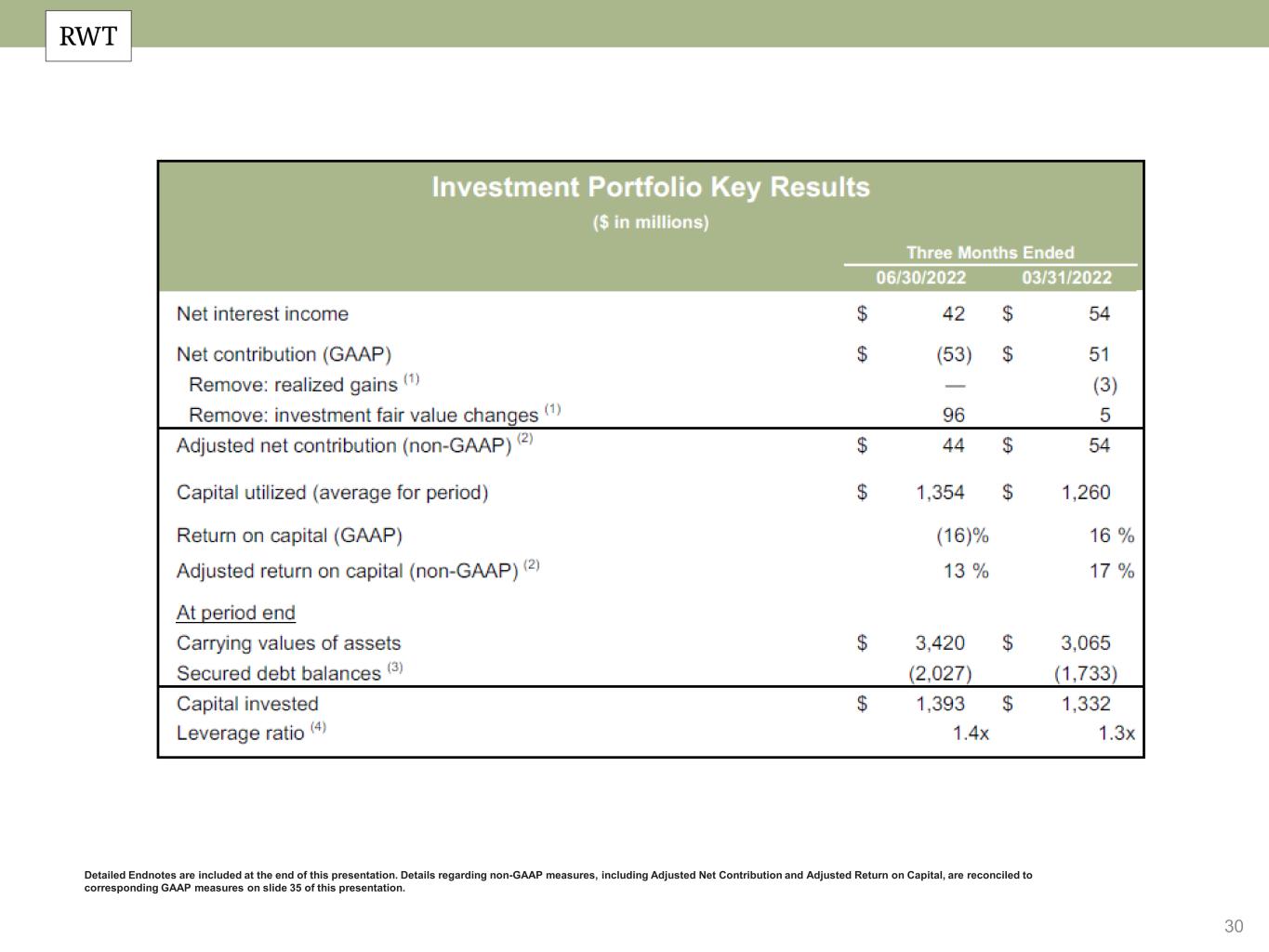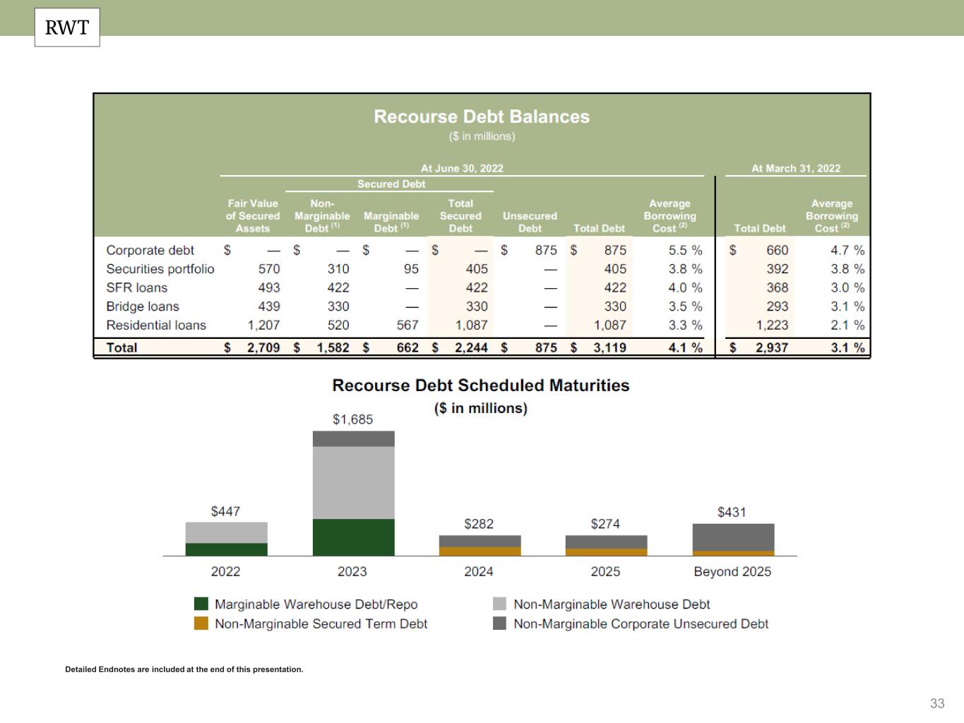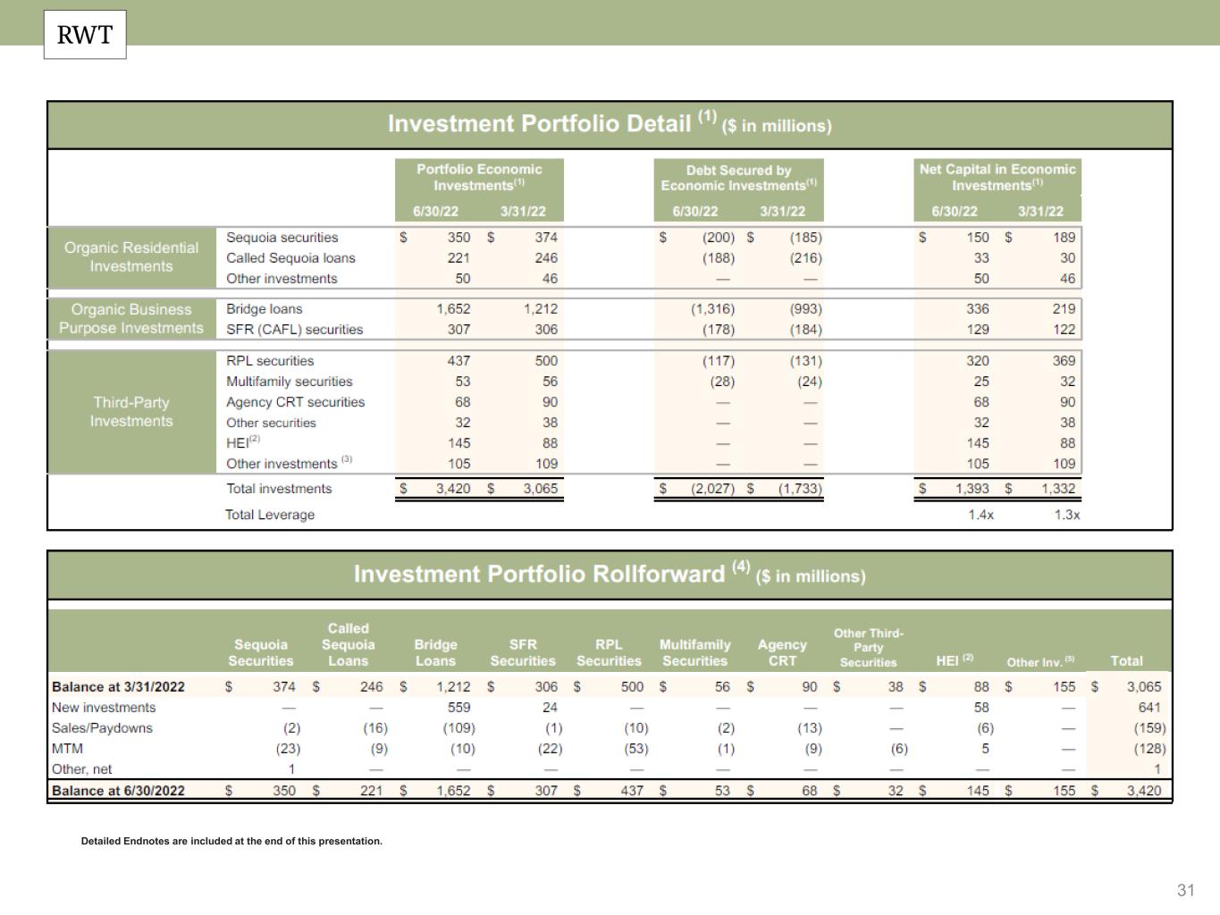 40 Endnotes Slide 30 (Appendix: Investment Portfolio Key Results) 1. Realized gains and investment fair value changes presented in this table to calculate Adjusted Net Contribution (non-GAAP), are presented on a tax-adjusted basis. 2. Adjusted Net Contribution and Adjusted Return on Capital are non-GAAP measures. Please refer to Non-GAAP Measures on slide 35 for more information. 3. Secured debt includes both recourse debt and non-recourse debt (including for bridge loans and resecuritized RPL securities), secured by our investment assets. 4. Leverage ratio is calculated as Secured debt balances divided by capital invested, as presented within this table. Slide 31 (Appendix: Investment Portfolio Detail) 1. Economic investments and associated secured debt presented in Investment Portfolio Detail table include our economic investments in consolidated VIEs and exclude the assets and debt within the VIEs that we consolidate under GAAP. See the Consolidated Balance Sheet on slide 25 for additional information on consolidated VIEs. 2. HEI investments presented in Investment Portfolio Detail and Rollforward tables include HEIs we own directly as well as our economic interests in our consolidated Point HEI entity. 3. Other third-party investments presented in the Investment Portfolio Detail table primarily includes investments in MSRs and our economic investments in consolidated Servicing Investment entities. 4. Amounts presented in Investment Portfolio Rollforward table represent our economic investments, which exclude assets of VIEs consolidated on our GAAP balance sheet and include our economic interests in those same consolidated VIEs. See the Consolidated Balance Sheet on slide 25 for additional information on consolidated VIEs. 5. Other investments presented in Investment Portfolio Rollforward table includes other investments within Organic Residential, Organic Business Purpose and Third-Party presented in the Investment Portfolio Detail table. Slide 32 (Appendix: Investment Portfolio Credit Characteristics) 1. Underlying loan performance information provided in this table is generally reported on a one-month lag. As such, the data reported in this table is from June 2022 reports, which reflect a loan performance date of May 31, 2022. 2. Sequoia Select and Sequoia Choice securities presented in this table include subordinate securities and do not include interest only or certificated servicing securities. 3. HPI updated average LTV is calculated based on the current loan balance and an updated property value amount that is formulaically adjusted from value at origination based on the FHFA home price index (HPI). 4. Delinquency percentages at underlying securitizations are calculated using unpaid principal balance ("UPB"). Aggregate delinquency amounts by security type are weighted using the market value of our investments in each securitization. Includes loans over 90 days delinquent and all loans in foreclosure (regardless of delinquency status). 5. "Investment thickness" represents the average size of the subordinate securities we own as investments in securitizations, relative to the average overall size of the securitizations. For example, if our investment thickness (of first-loss securities) with respect to a particular securitization is 10%, we have exposure to the first 10% of credit losses resulting from loans underlying that securitization. Investment thickness is not applicable to our BPL Bridge Loan investments as they are whole loans. 6. Average current debt service coverage ratio (or DSCR) with respect to a loan is the ratio by which net operating income of the underlying property exceeds its fixed debt costs. 7. Average loan to value (or LTV) (at origination) is calculated based on the original loan amount and the property value at the time the loan was originated. Slide 33 (Appendix: Recourse Debt Balances) 1. Non-Marginable debt and marginable debt refers to whether such debt is subject to margin calls based solely on the lender’s determination in its discretion of the market value of underlying collateral that is non- delinquent. 2. Average borrowing cost represents the weighted average contractual cost of recourse debt outstanding at the end of each period presented and does not include deferred issuance costs or debt discounts.