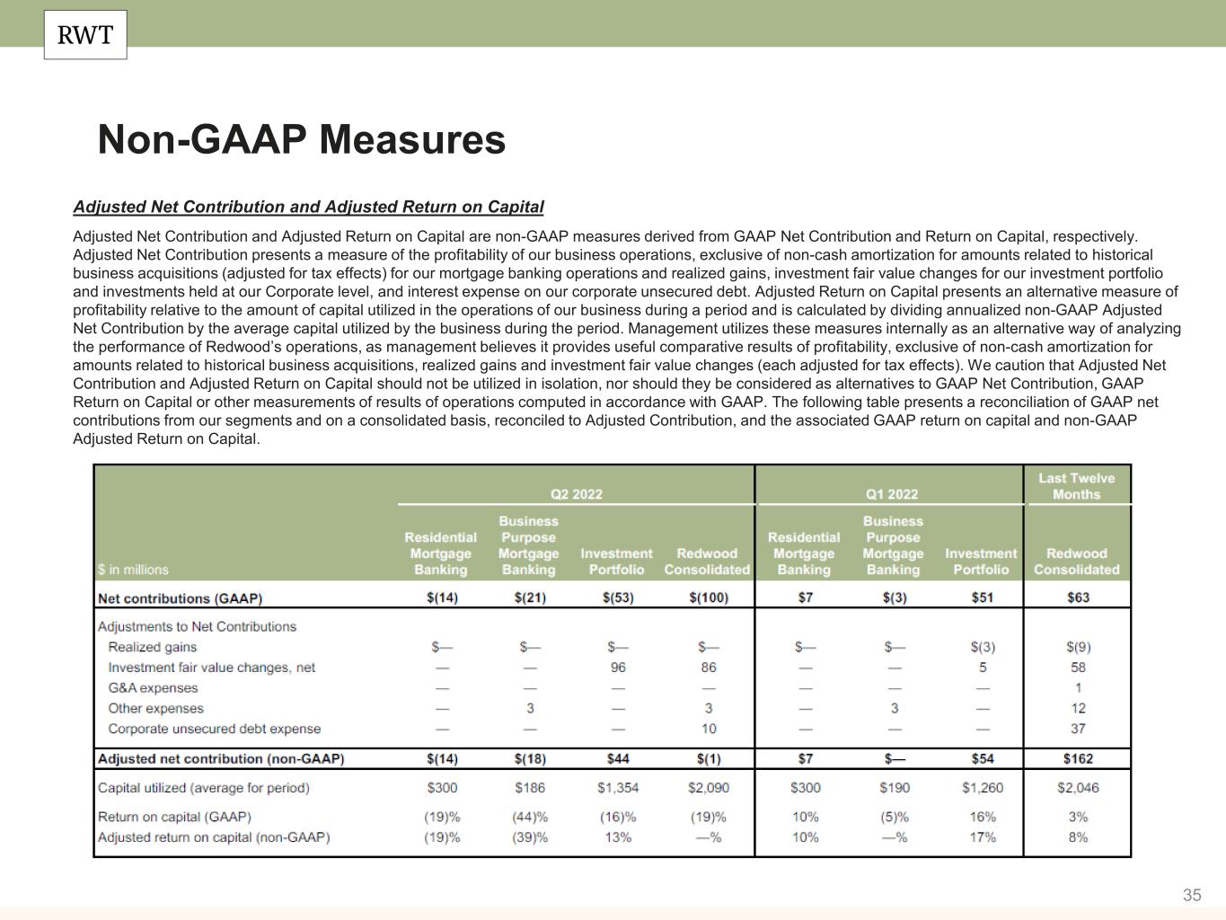 35 Non-GAAP Measures Adjusted Net Contribution and Adjusted Return on Capital Adjusted Net Contribution and Adjusted Return on Capital are non-GAAP measures derived from GAAP Net Contribution and Return on Capital, respectively. Adjusted Net Contribution presents a measure of the profitability of our business operations, exclusive of non-cash amortization for amounts related to historical business acquisitions (adjusted for tax effects) for our mortgage banking operations and realized gains, investment fair value changes for our investment portfolio and investments held at our Corporate level, and interest expense on our corporate unsecured debt. Adjusted Return on Capital presents an alternative measure of profitability relative to the amount of capital utilized in the operations of our business during a period and is calculated by dividing annualized non-GAAP Adjusted Net Contribution by the average capital utilized by the business during the period. Management utilizes these measures internally as an alternative way of analyzing the performance of Redwood’s operations, as management believes it provides useful comparative results of profitability, exclusive of non-cash amortization for amounts related to historical business acquisitions, realized gains and investment fair value changes (each adjusted for tax effects). We caution that Adjusted Net Contribution and Adjusted Return on Capital should not be utilized in isolation, nor should they be considered as alternatives to GAAP Net Contribution, GAAP Return on Capital or other measurements of results of operations computed in accordance with GAAP. The following table presents a reconciliation of GAAP net contributions from our segments and on a consolidated basis, reconciled to Adjusted Contribution, and the associated GAAP return on capital and non-GAAP Adjusted Return on Capital. $ in millions