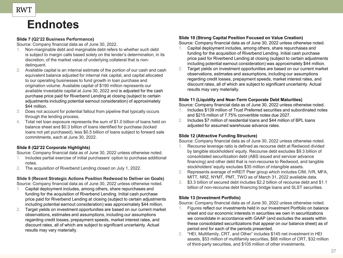 37 Endnotes Slide 7 (Q2’22 Business Performance) Source: Company financial data as of June 30, 2022. 1. Non-marginable debt and marginable debt refers to whether such debt is subject to margin calls based solely on the lender’s determination, in its discretion, of the market value of underlying collateral that is non- delinquent. 2. Available capital is an internal estimate of the portion of our cash and cash equivalent balance adjusted for internal risk capital, and capital allocated to our operating businesses to fund growth in loan purchase and origination volume. Available capital of $190 million represents our available investable capital at June 30, 2022 and is adjusted for the cash purchase price paid for Riverbend Lending at closing (subject to certain adjustments including potential earnout consideration) of approximately $44 million. 3. Does not account for potential fallout from pipeline that typically occurs through the lending process. 4. Total net loan exposure represents the sum of $1.0 billion of loans held on balance sheet and $0.3 billion of loans identified for purchase (locked loans not yet purchased), less $0.5 billion of loans subject to forward sale commitments, each at June 30, 2022. Slide 8 (Q2’22 Corporate Highlights) Source: Company financial data as of June 30, 2022 unless otherwise noted. 1. Includes partial exercise of initial purchasers’ option to purchase additional notes. 2. The acquisition of Riverbend Lending closed on July 1, 2022. Slide 9 (Recent Strategic Actions Position Redwood to Deliver on Goals) Source: Company financial data as of June 30, 2022 unless otherwise noted. 1. Capital deployment includes, among others, share repurchases and funding for the acquisition of Riverbend Lending. Initial cash purchase price paid for Riverbend Lending at closing (subject to certain adjustments including potential earnout consideration) was approximately $44 million. 2. Target yields on investment opportunities are based on our current market observations, estimates and assumptions, including our assumptions regarding credit losses, prepayment speeds, market interest rates, and discount rates, all of which are subject to significant uncertainty. Actual results may vary materially. Slide 10 (Strong Capital Position Focused on Value Creation) Source: Company financial data as of June 30, 2022 unless otherwise noted. 1. Capital deployment includes, among others, share repurchases and funding for the acquisition of Riverbend Lending. Initial cash purchase price paid for Riverbend Lending at closing (subject to certain adjustments including potential earnout consideration) was approximately $44 million. 2. Target yields on investment opportunities are based on our current market observations, estimates and assumptions, including our assumptions regarding credit losses, prepayment speeds, market interest rates, and discount rates, all of which are subject to significant uncertainty. Actual results may vary materially. Slide 11 (Liquidity and Near-Term Corporate Debt Maturities) Source: Company financial data as of June 30, 2022 unless otherwise noted. 1. Includes $139 million of Trust Preferred securities and subordinated notes and $215 million of 7.75% convertible notes due 2027. 2. Includes $7 million of residential loans and $44 million of BPL loans adjusted for assumed warehouse advance rates. Slide 12 (Attractive Funding Structure) Source: Company financial data as of June 30, 2022 unless otherwise noted. 1. Recourse leverage ratio is defined as recourse debt at Redwood divided by tangible stockholders' equity. Recourse debt excludes $9.3 billion of consolidated securitization debt (ABS issued and servicer advance financing) and other debt that is non-recourse to Redwood, and tangible stockholders' equity excludes $35 million of intangible assets. 2. Represents average of mREIT Peer group which includes CIM, IVR, MFA, MITT, NRZ, NYMT, PMT, TWO as of March 31, 2022 available data. 3. $3.3 billion of secured debt includes $2.2 billion of recourse debt and $1.1 billion of non-recourse debt financing bridge loans and SLST securities. Slide 13 (Investment Portfolio) Source: Company financial data as of June 30, 2022 unless otherwise noted. 1. Figures reflect our investments held in our Investment Portfolio on balance sheet and our economic interests in securities we own in securitizations we consolidate in accordance with GAAP (and excludes the assets within these consolidated securitizations that appear on our balance sheet) as of period end for each of the periods presented. 2. “HEI, Multifamily, CRT, and Other” includes $145 net investment in HEI assets, $53 million of multifamily securities, $68 million of CRT, $32 million of third-party securities, and $105 million of other investments.