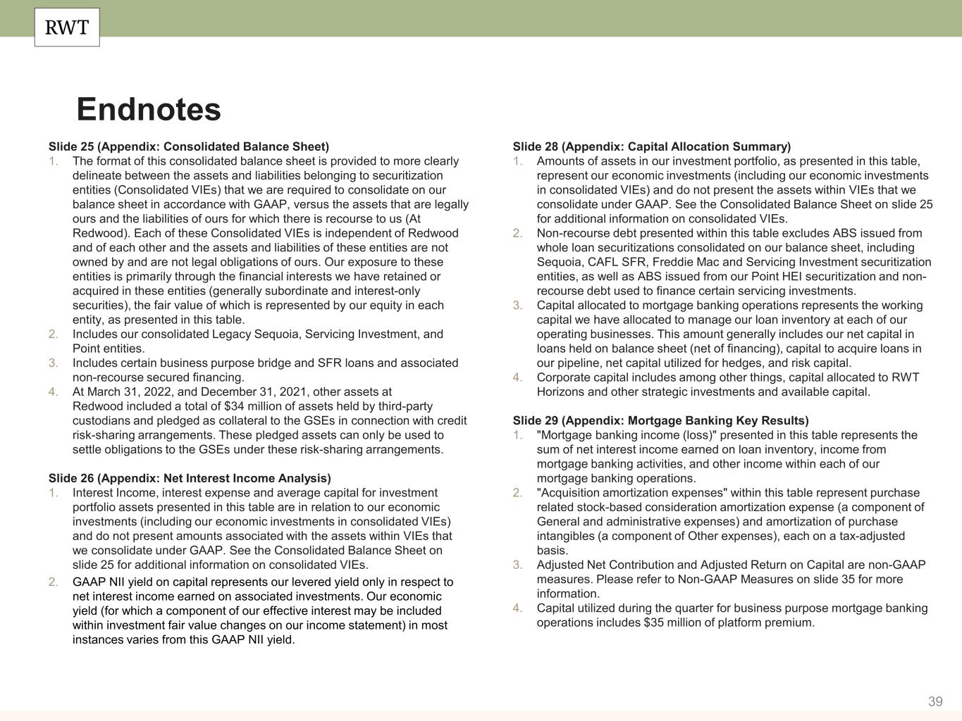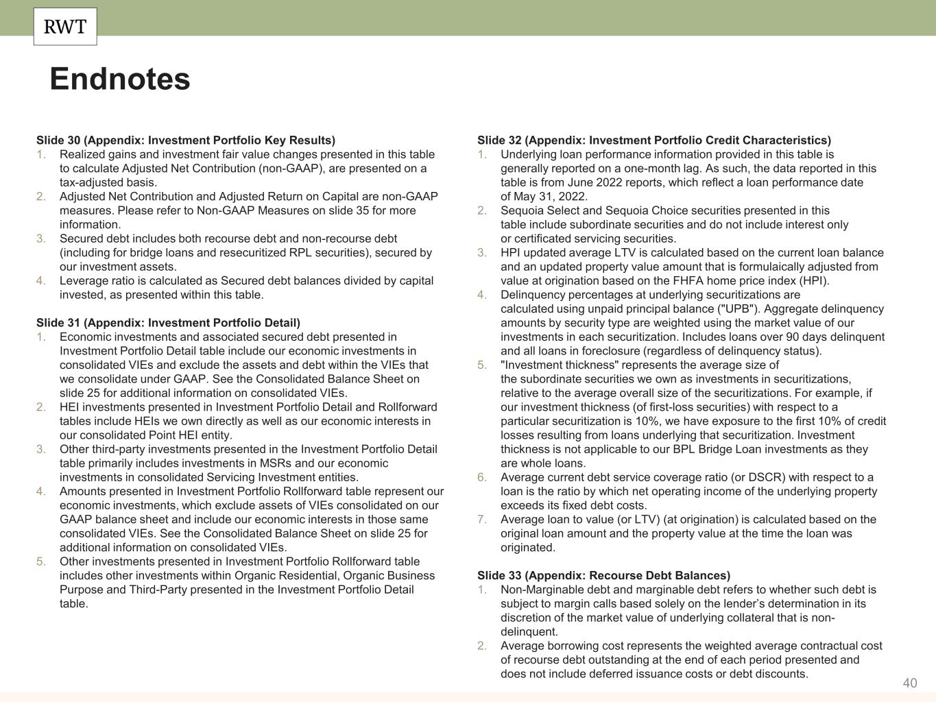 39 Endnotes Slide 25 (Appendix: Consolidated Balance Sheet) 1. The format of this consolidated balance sheet is provided to more clearly delineate between the assets and liabilities belonging to securitization entities (Consolidated VIEs) that we are required to consolidate on our balance sheet in accordance with GAAP, versus the assets that are legally ours and the liabilities of ours for which there is recourse to us (At Redwood). Each of these Consolidated VIEs is independent of Redwood and of each other and the assets and liabilities of these entities are not owned by and are not legal obligations of ours. Our exposure to these entities is primarily through the financial interests we have retained or acquired in these entities (generally subordinate and interest-only securities), the fair value of which is represented by our equity in each entity, as presented in this table. 2. Includes our consolidated Legacy Sequoia, Servicing Investment, and Point entities. 3. Includes certain business purpose bridge and SFR loans and associated non-recourse secured financing. 4. At March 31, 2022, and December 31, 2021, other assets at Redwood included a total of $34 million of assets held by third-party custodians and pledged as collateral to the GSEs in connection with credit risk-sharing arrangements. These pledged assets can only be used to settle obligations to the GSEs under these risk-sharing arrangements. Slide 26 (Appendix: Net Interest Income Analysis) 1. Interest Income, interest expense and average capital for investment portfolio assets presented in this table are in relation to our economic investments (including our economic investments in consolidated VIEs) and do not present amounts associated with the assets within VIEs that we consolidate under GAAP. See the Consolidated Balance Sheet on slide 25 for additional information on consolidated VIEs. 2. GAAP NII yield on capital represents our levered yield only in respect to net interest income earned on associated investments. Our economic yield (for which a component of our effective interest may be included within investment fair value changes on our income statement) in most instances varies from this GAAP NII yield. Slide 28 (Appendix: Capital Allocation Summary) 1. Amounts of assets in our investment portfolio, as presented in this table, represent our economic investments (including our economic investments in consolidated VIEs) and do not present the assets within VIEs that we consolidate under GAAP. See the Consolidated Balance Sheet on slide 25 for additional information on consolidated VIEs. 2. Non-recourse debt presented within this table excludes ABS issued from whole loan securitizations consolidated on our balance sheet, including Sequoia, CAFL SFR, Freddie Mac and Servicing Investment securitization entities, as well as ABS issued from our Point HEI securitization and non- recourse debt used to finance certain servicing investments. 3. Capital allocated to mortgage banking operations represents the working capital we have allocated to manage our loan inventory at each of our operating businesses. This amount generally includes our net capital in loans held on balance sheet (net of financing), capital to acquire loans in our pipeline, net capital utilized for hedges, and risk capital. 4. Corporate capital includes among other things, capital allocated to RWT Horizons and other strategic investments and available capital. Slide 29 (Appendix: Mortgage Banking Key Results) 1. "Mortgage banking income (loss)" presented in this table represents the sum of net interest income earned on loan inventory, income from mortgage banking activities, and other income within each of our mortgage banking operations. 2. "Acquisition amortization expenses" within this table represent purchase related stock-based consideration amortization expense (a component of General and administrative expenses) and amortization of purchase intangibles (a component of Other expenses), each on a tax-adjusted basis. 3. Adjusted Net Contribution and Adjusted Return on Capital are non-GAAP measures. Please refer to Non-GAAP Measures on slide 35 for more information. 4. Capital utilized during the quarter for business purpose mortgage banking operations includes $35 million of platform premium.